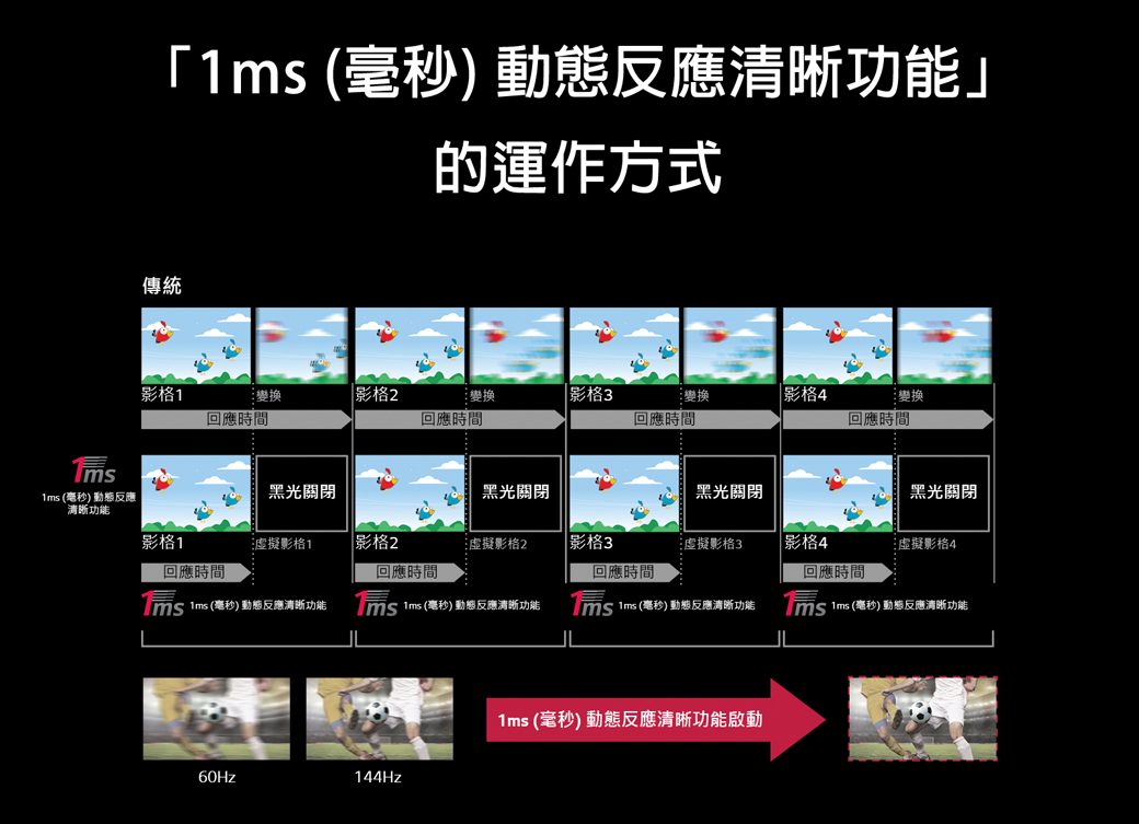 啟動 1ms (毫秒) 動態反應清晰功能時,會閃黑光,產生黑色影像插入效果,而該效果與每秒變換影隔兩次的效果類似。可減少動態模糊效果,因為黑光在液晶上和下期間會關閉,而不會產生/重現影格。因此,啟動 1ms (毫秒) 動態反應清晰功能時,回應時間加速。