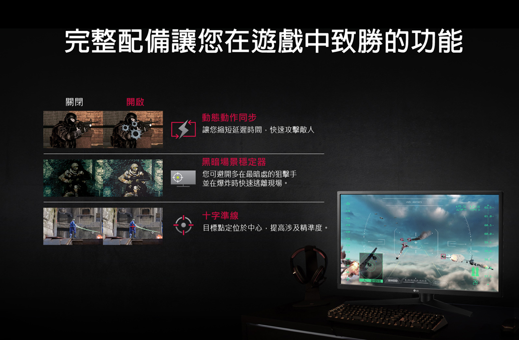 黑暗場景穩定器感應最黑暗的區域並且讓它變得更明亮,讓您可以發現在黑暗中隱藏您的敵人。動態同步模式 (Dynamic Action Sync) 讓您瞬間攻擊對手毫不延遲。且十字準線讓您在 FPS 類的射擊遊戲中能更能容瞄準中心處,進而提升精確度。