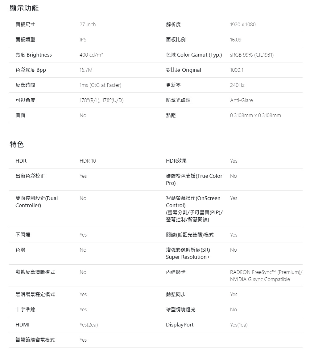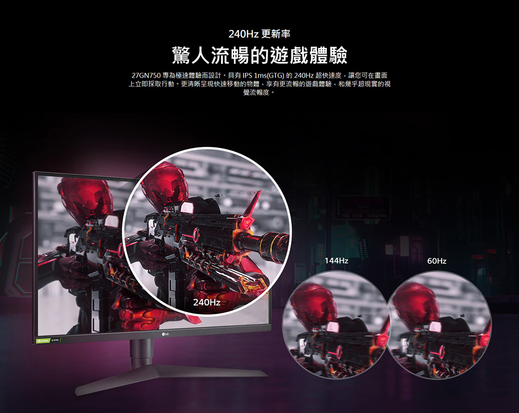 LG 27GN750-B(2H1P/1ms/IPS/240Hz/無喇叭/FreeSync/HDR10)*G-sync兼容)