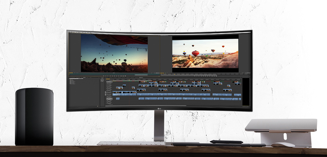 LG 21:9 UltraWide™曲面顯示器擁有QHD (3440x1440)寬螢幕版面。對於同時使用不同的應用程式控制與監視更多快取縮圖或時間軸很理想。
