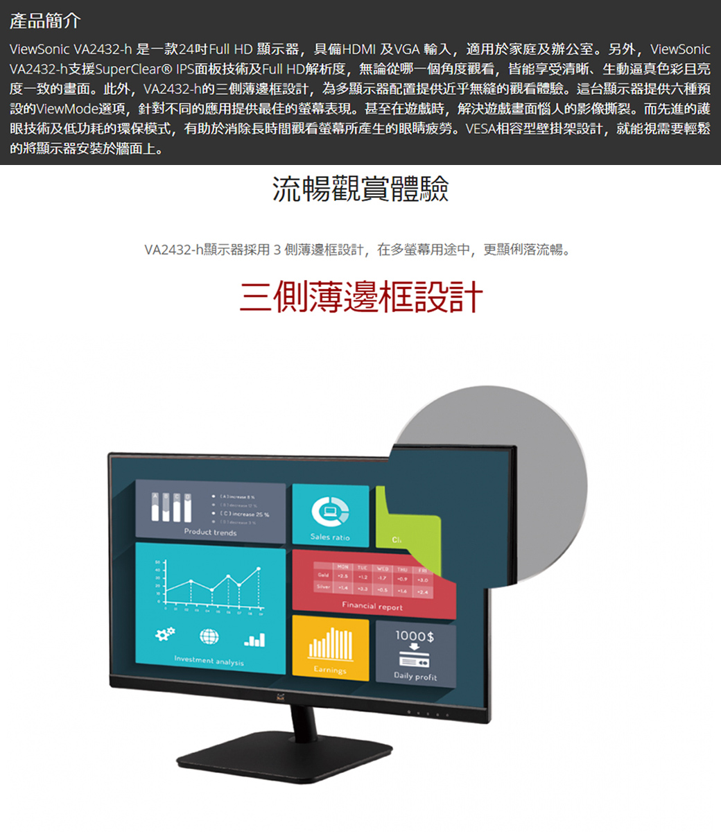 ViewSonic VA2432-H(1A1H/4ms/IPS/無喇叭)零閃屏技術.抗藍光技術.三側薄邊框設計