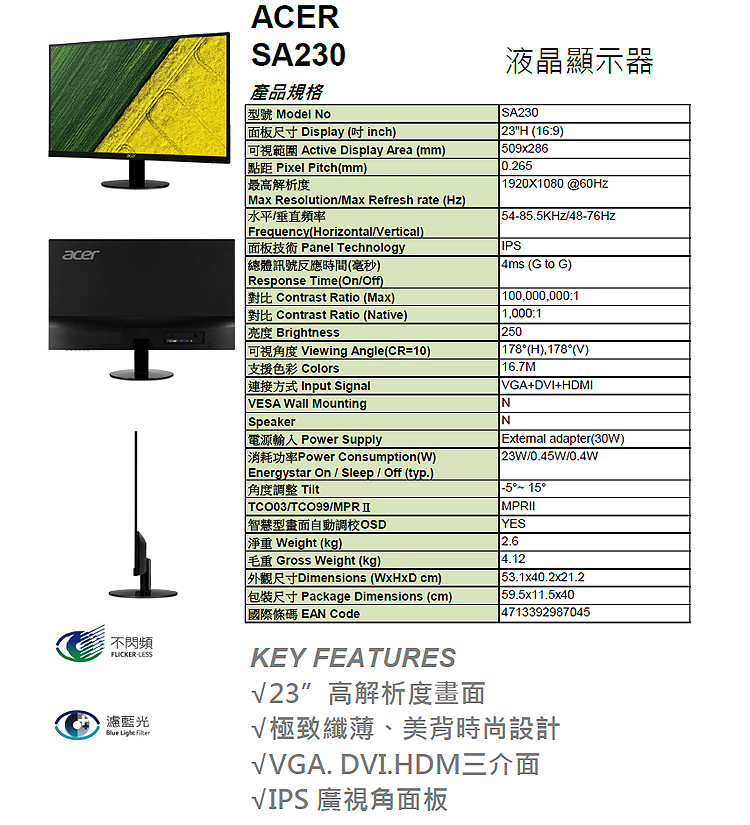 ACER SA230(1A1D1H/4ms/IPS/無喇叭)SA超纖薄美形.無邊框.三介面
