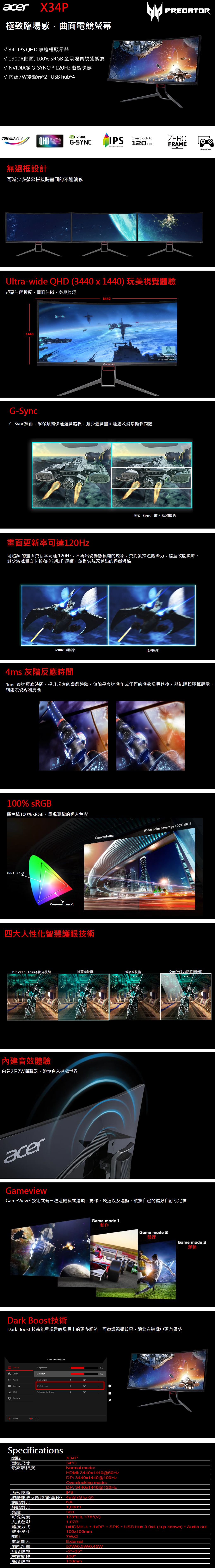 ACER Predator X34P(1H1P/4ms/IPS曲面/120Hz/含喇叭)*G-sync.HDR 電競機