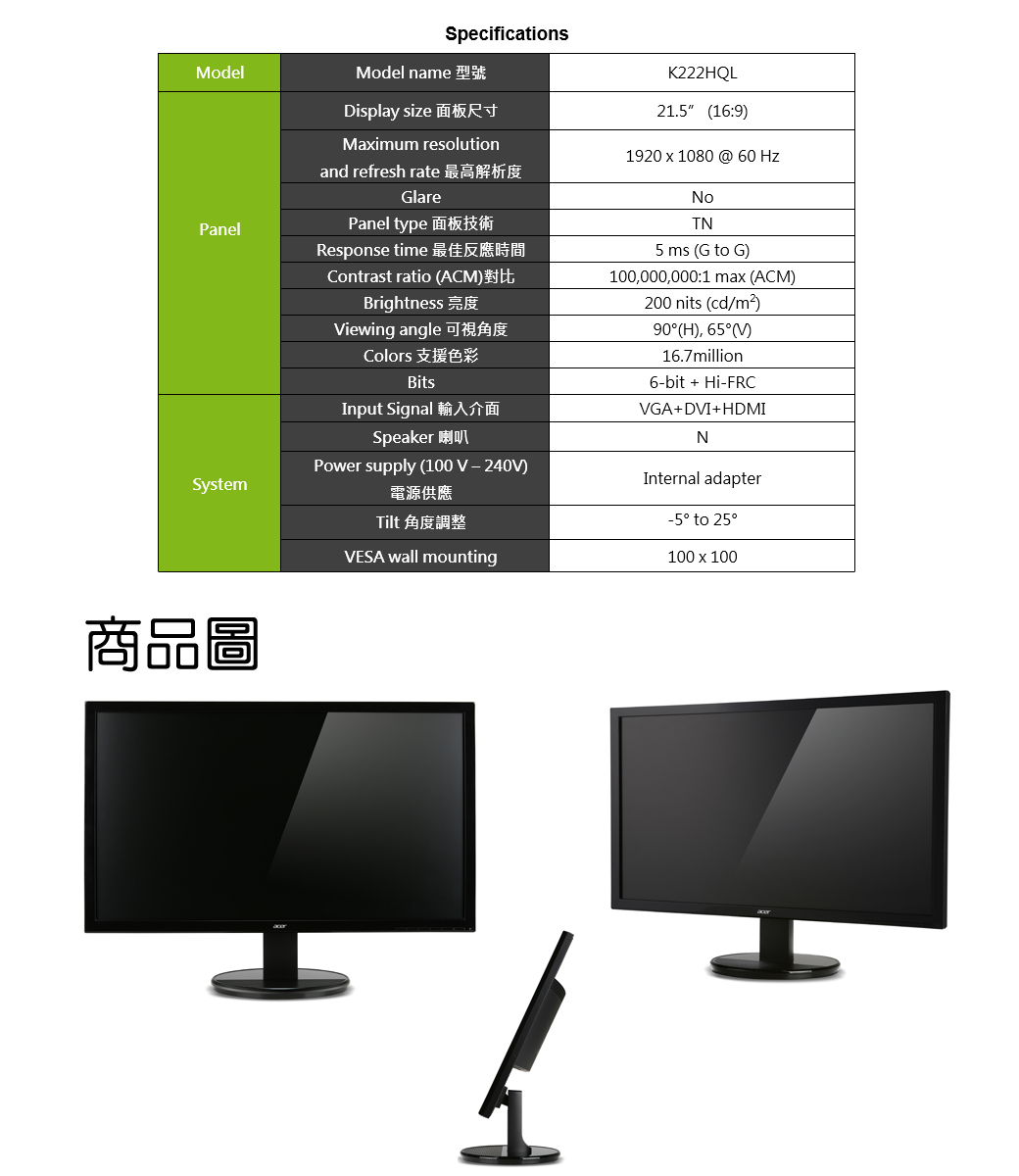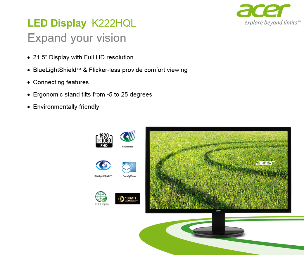 ACER K222HQL bid(1A1D1H/5ms/TN/無喇叭) 低藍光.護眼