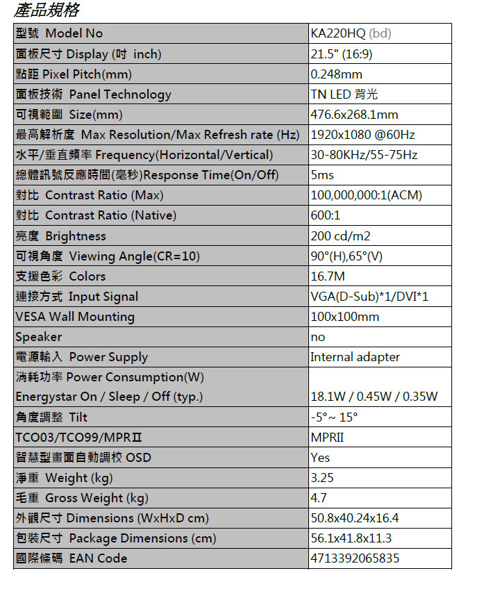 ACER KA220HQ bd(1A1D/5ms/TN/無喇叭)低藍光.不閃屏