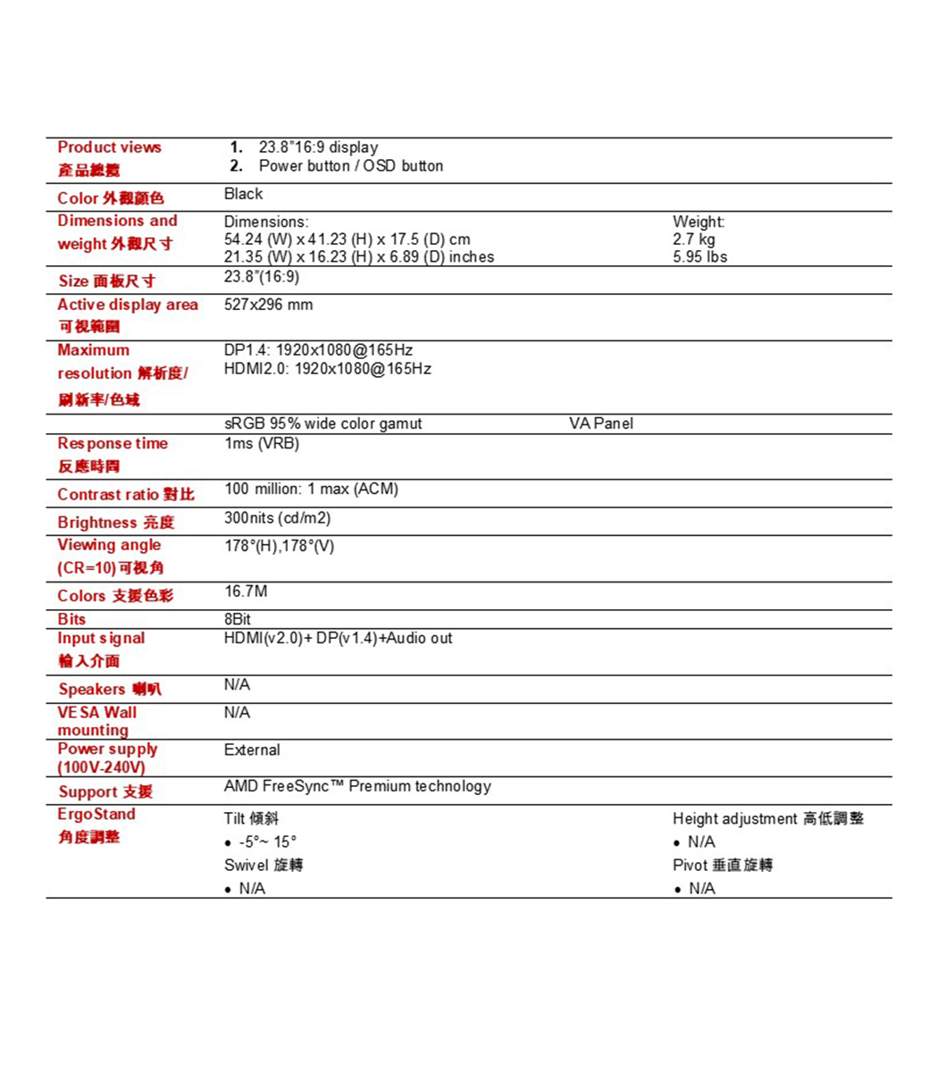 ACER QG240Y P3(1H1P/1ms/VA/165Hz/無喇叭/FreeSync Premium)