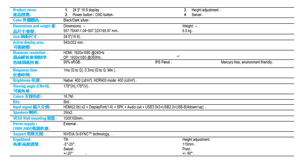 ACER Predator X25 (2H1P/IPS/360Hz/含喇叭/G-sync/HDR400)