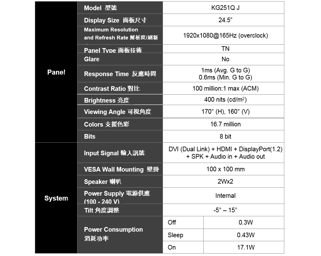 ACER KG251Q J(1D1H1P/1ms/TN/165Hz/含喇叭/FreeSync)無邊框電競機