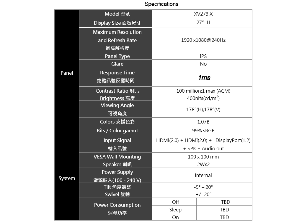 ACER XV273 X(2H1P/1ms/IPS/240Hz/含喇叭/FreeSync/HDR400)