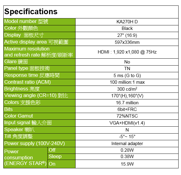ACER KA270H D(1A1H/5ms/TN/無喇叭) 窄邊框.護眼.入門款