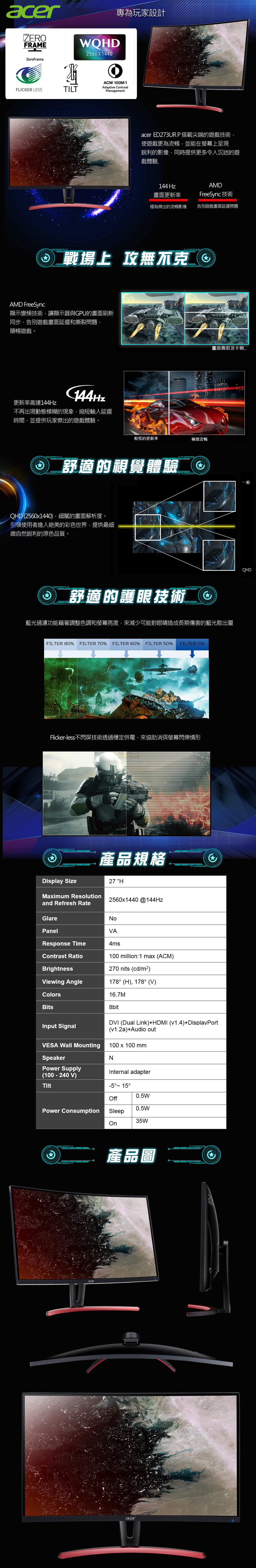 ACER ED273UR P(1D1H1P/4ms/VA曲面/144Hz/無喇叭/FreeSync)無邊框電競機