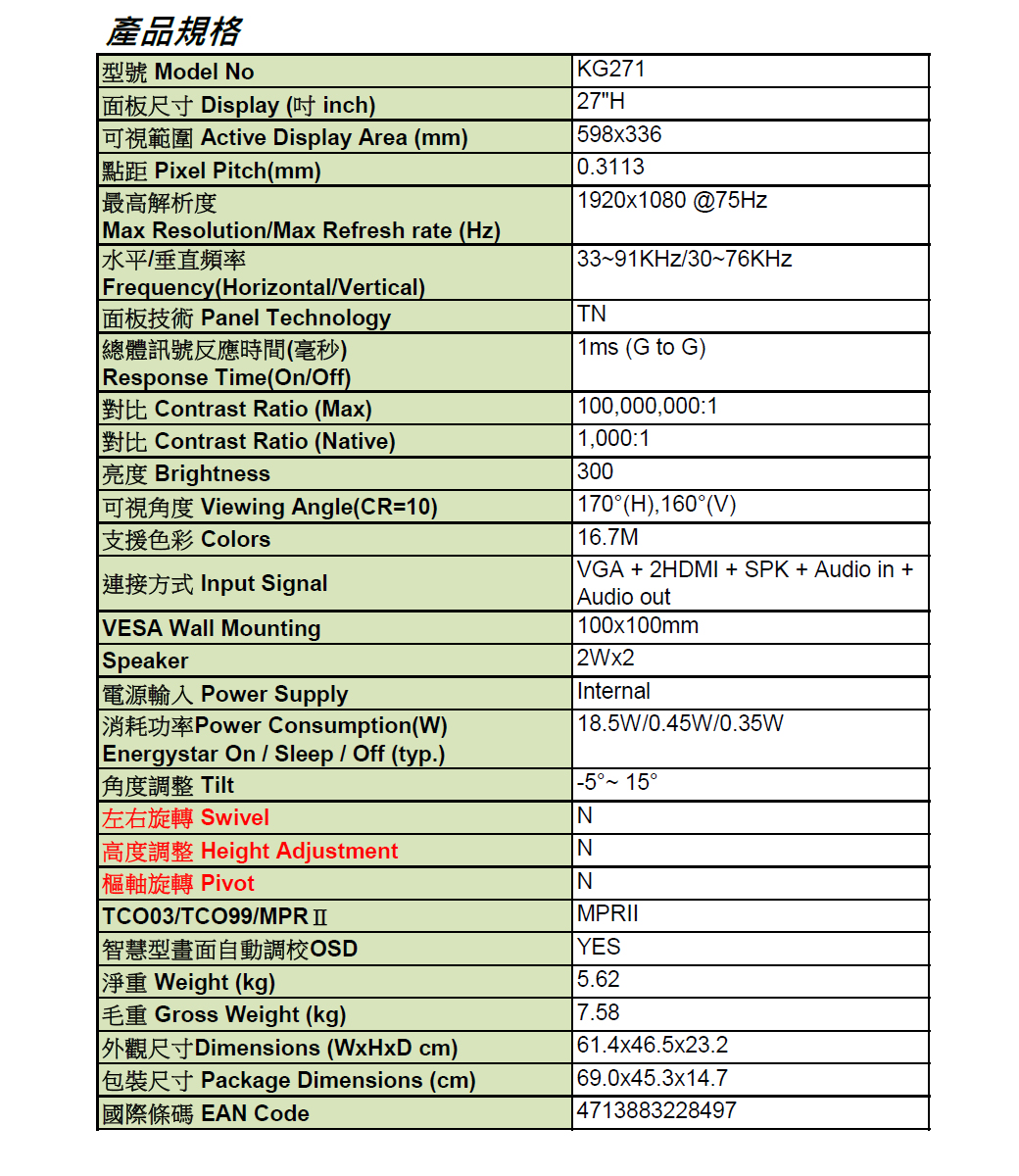 ACER KG271(1A2H/1ms/TN/含喇叭)FreeSync 電競機