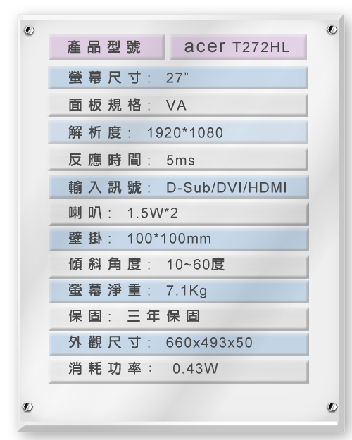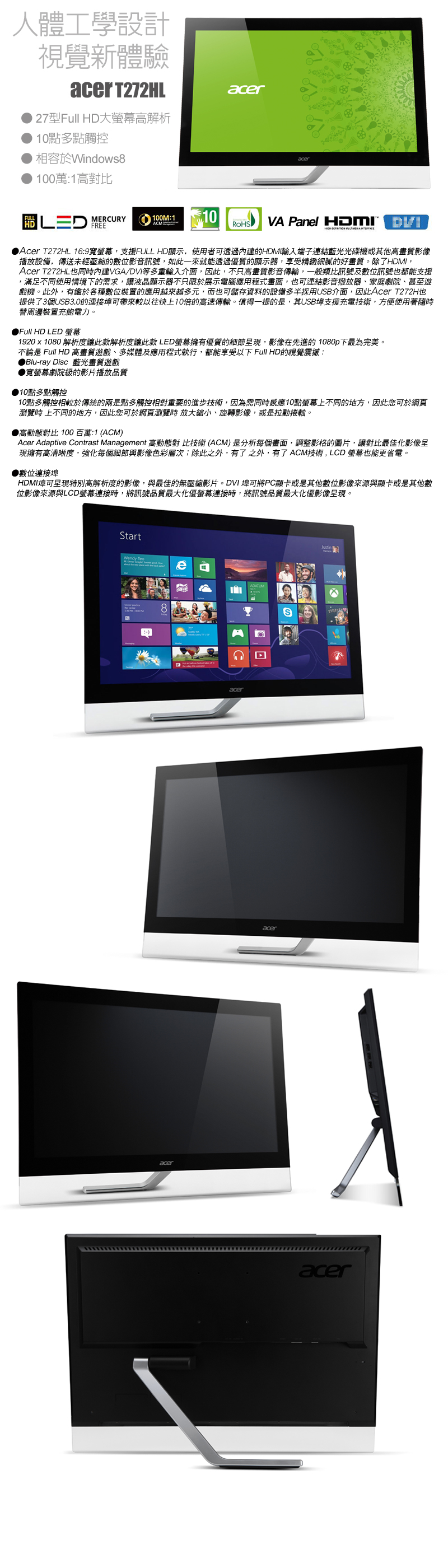 ACER T272HL(10點觸控/1A2H/5ms/VA/含喇叭) *相容Win8
