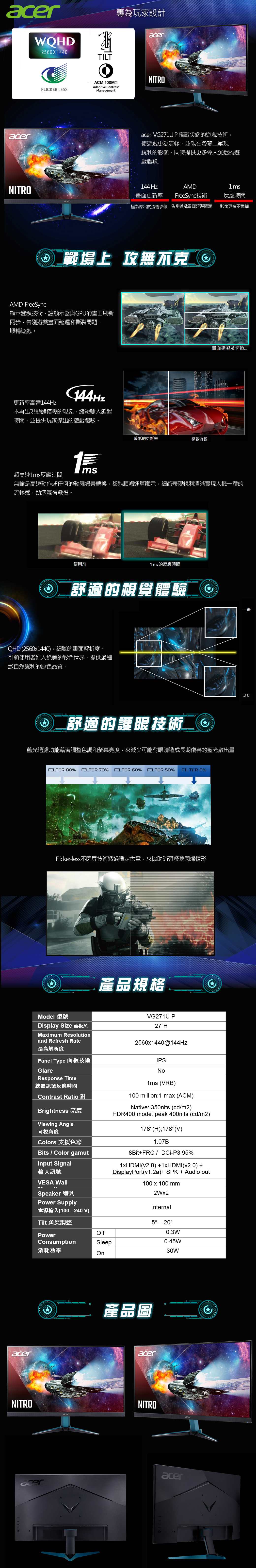 ACER VG271U P(2H1P/1ms/IPS/144Hz/含喇叭/FreeSync/HDR)