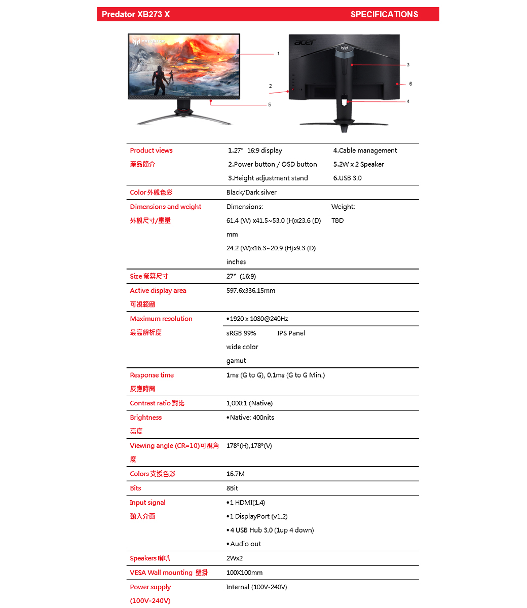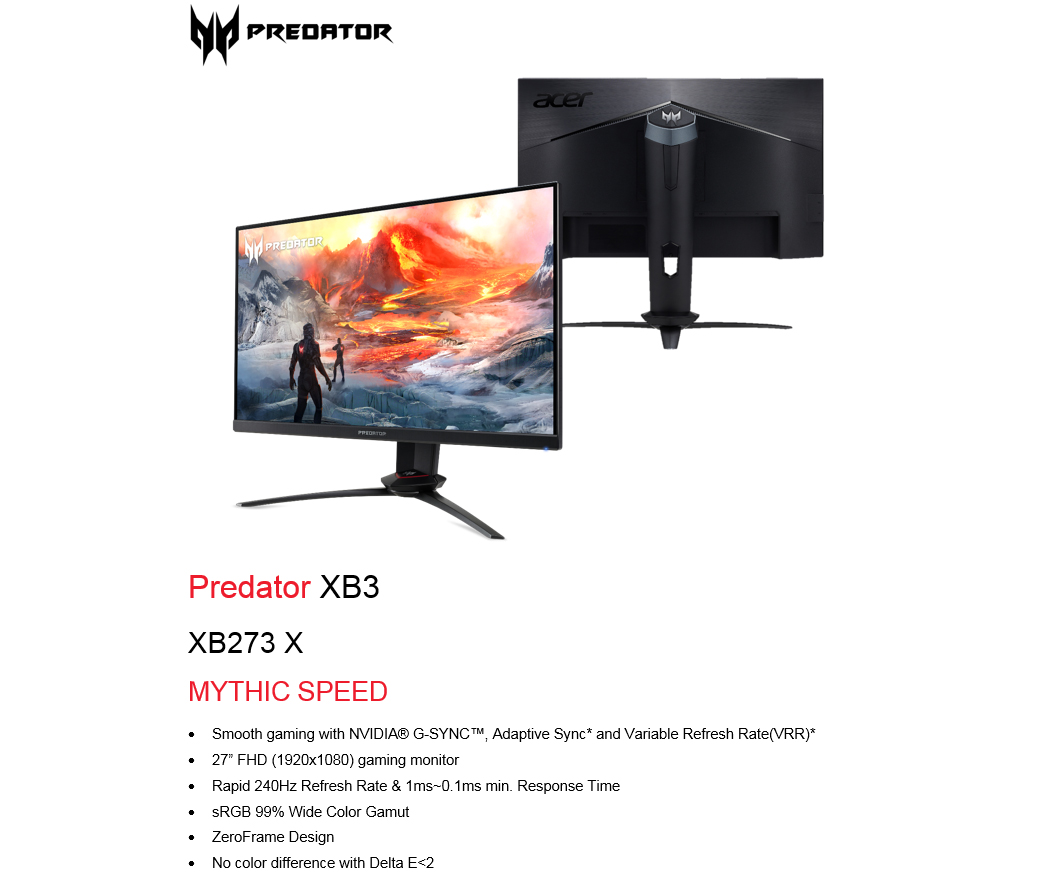 ACER Predator XB273 X(1H1P/1ms/IPS/240Hz/含喇叭/G-Sync) 極速
