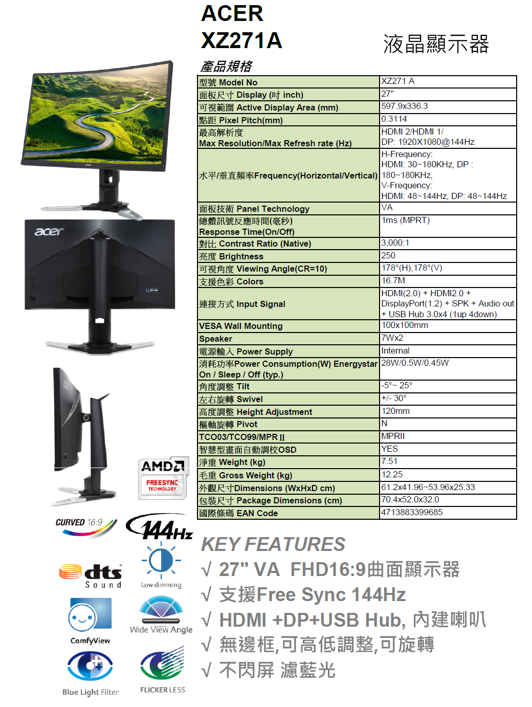 ACER XZ271 A(2H1P/1ms/VA曲面/144Hz/含喇叭)FreeSync電競機