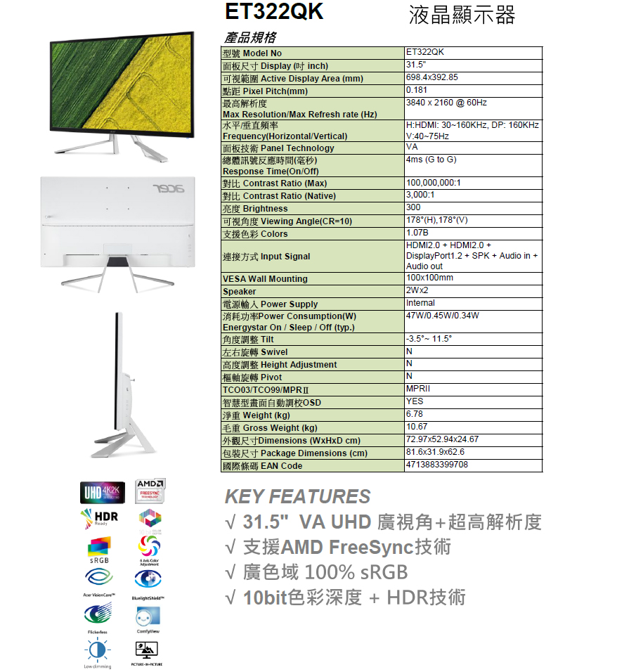 ACER ET322QK(2H1P/4ms/VA/含喇叭/FreeSync/HDR)電競螢幕.白色