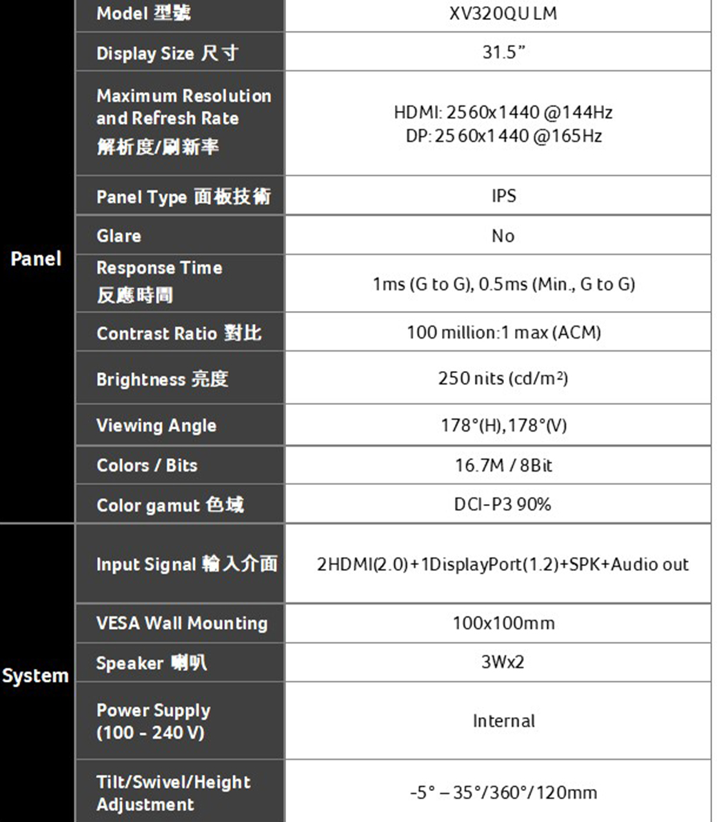 ACER XV320QU LM(2H1P/0.5ms/IPS/165Hz/含喇叭/FreeSync Premium/HDR10)