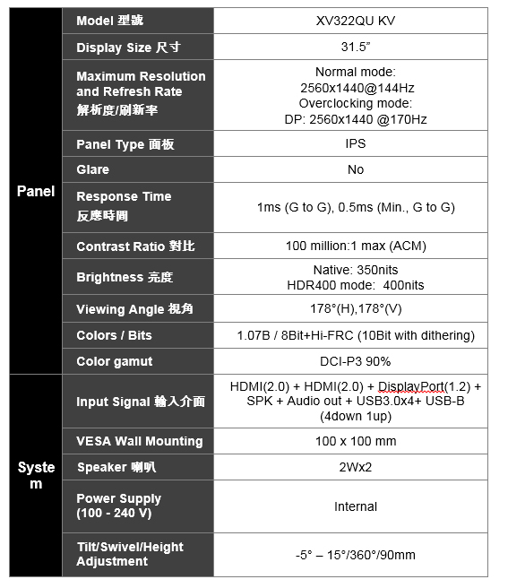 ACER XV322QU KV(2H1P/0.5ms/IPS/170Hz/含喇叭/FreeSync Premium/HDR400)