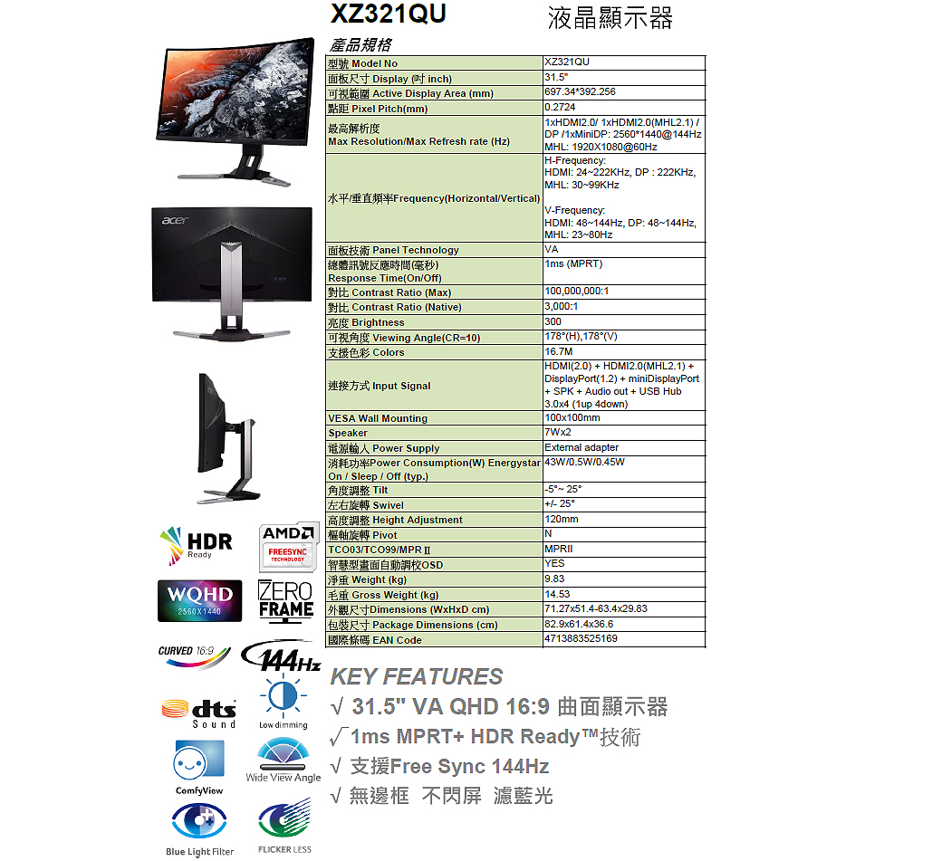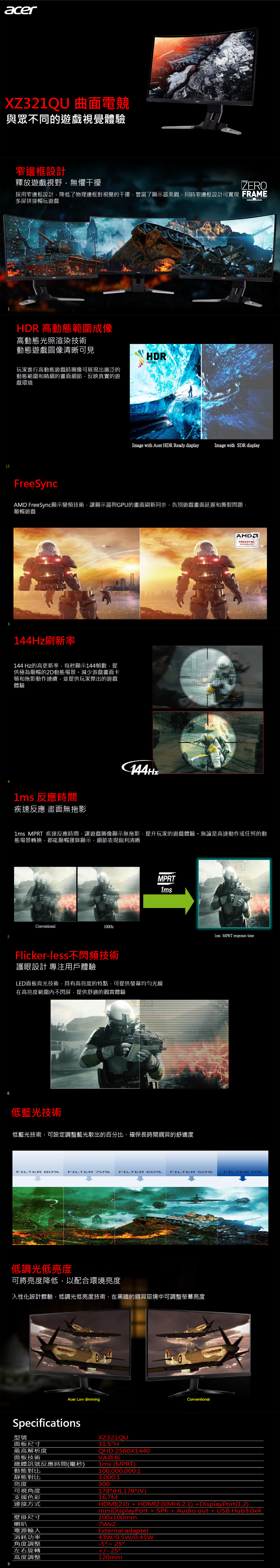 ACER XZ321QU(2H1P1MP/1ms/VA曲面/144Hz/含喇叭/FreeSync/HDR)