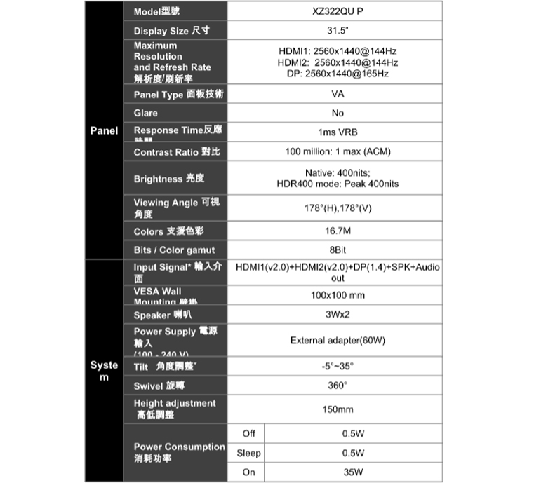 ACER XZ322QU P(2H1P/1ms/VA曲面/165Hz/含喇叭/FreeSync/HDR400)