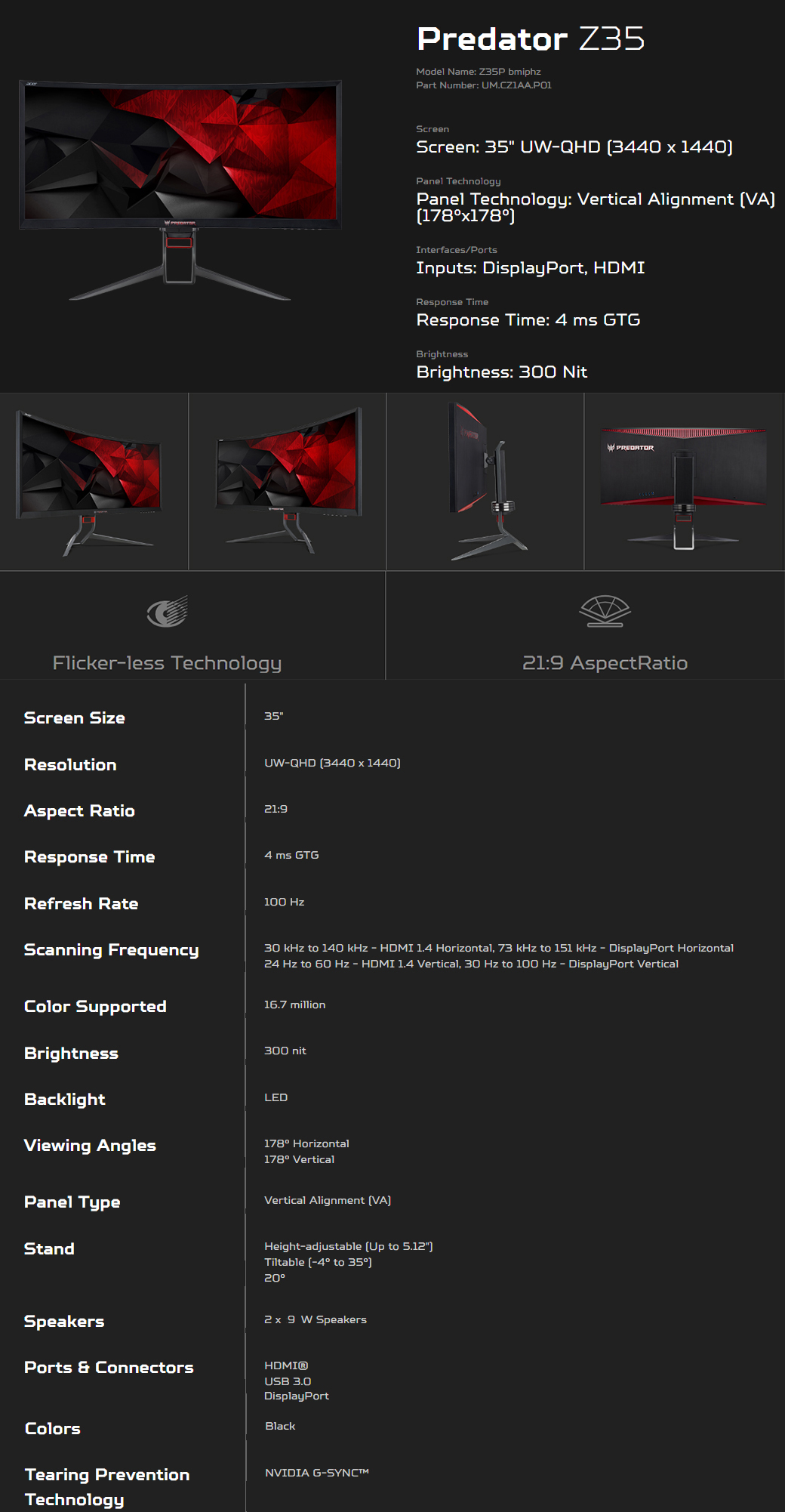 ACER Predator Z35P(1H1P/4ms/VA曲面/120Hz/含喇叭/G-sync)