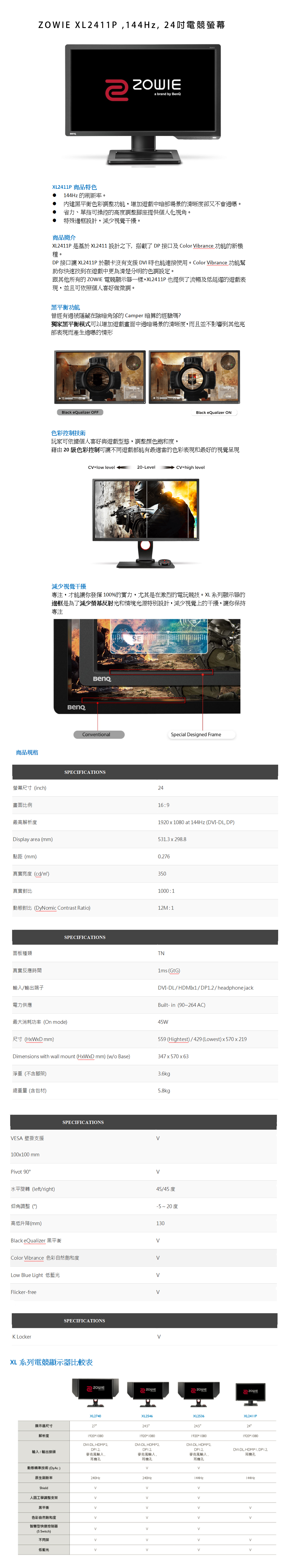BenQ ZOWIE XL2411P(1D1H1P/1200萬/1ms/TN/144Hz/無喇叭)專業電