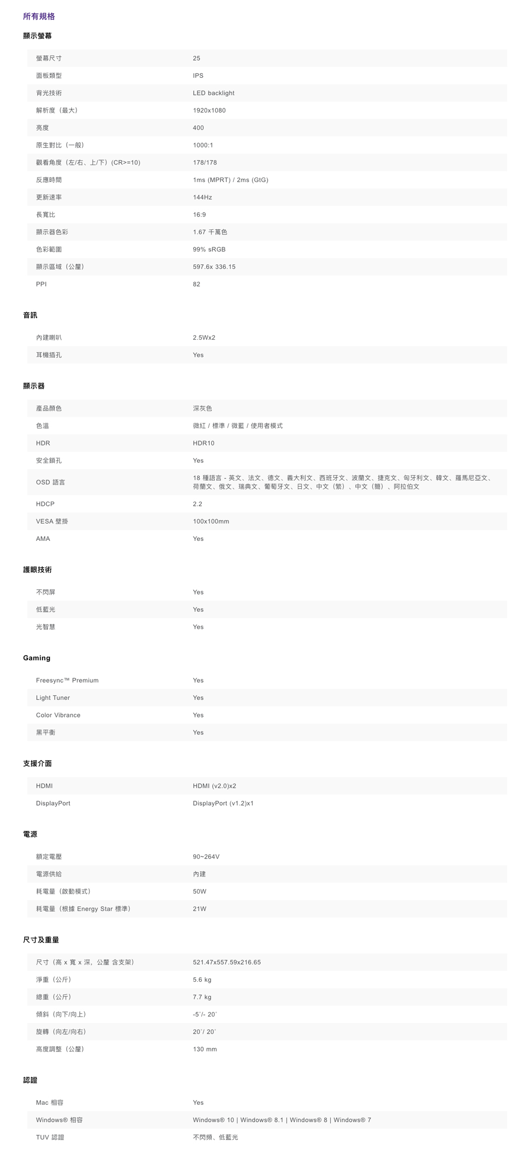 1920*1080 FHD解析│HDR│G-Sync相容│1ms│144Hz