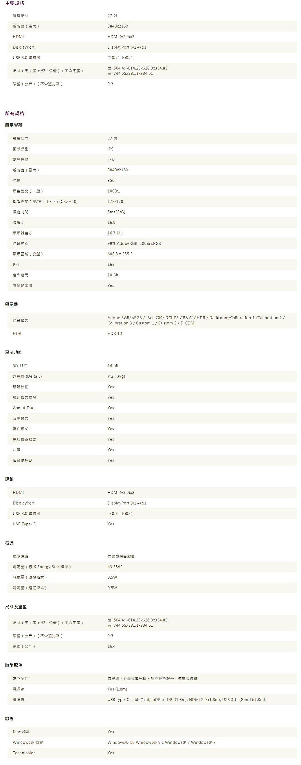 BENQ SW271(2H1P1C/5ms/IPS/無喇叭)HDR.升降旋轉 *專業色彩管理螢幕