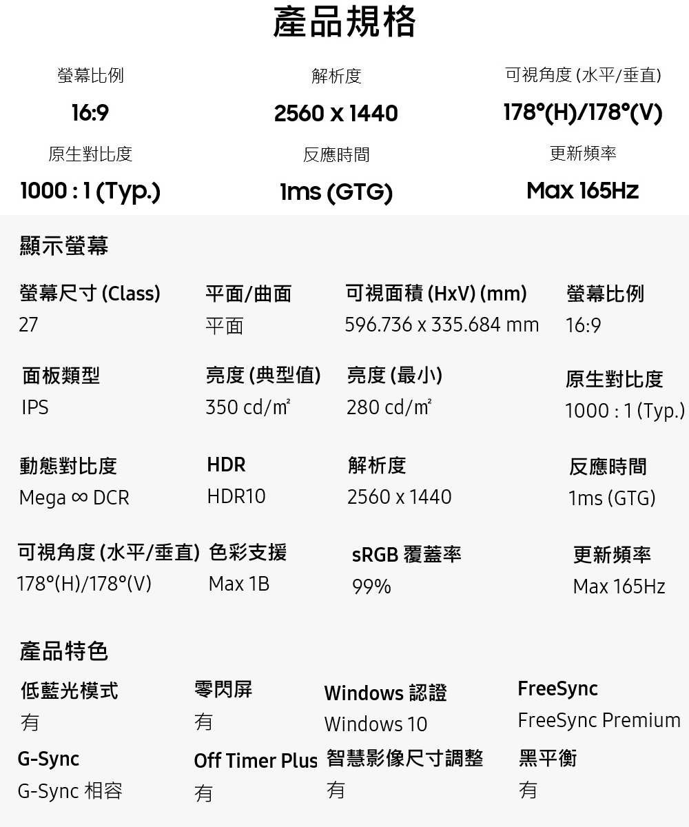 三星 S27AG500NC(G5/1H1P/1ms/IPS/165Hz/無喇叭/G-SYNC兼容/HDR10)