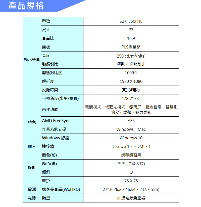 三星 S27F350FHE(1A1H/1000/4ms/PLS/無喇叭)