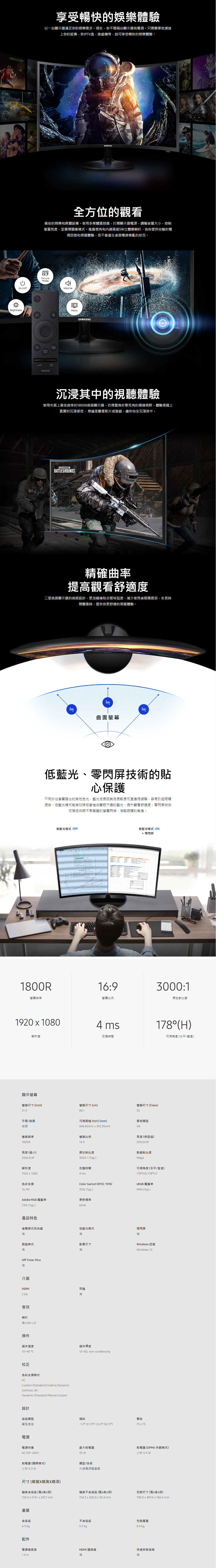 三星 C32F39MFUC(2H/4ms/VA曲面/含喇叭) 內附遙控器.低藍光.零閃頻