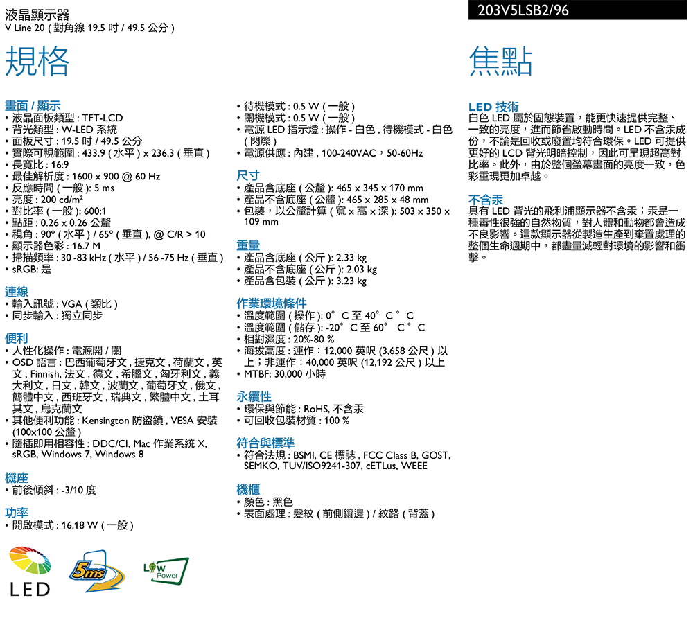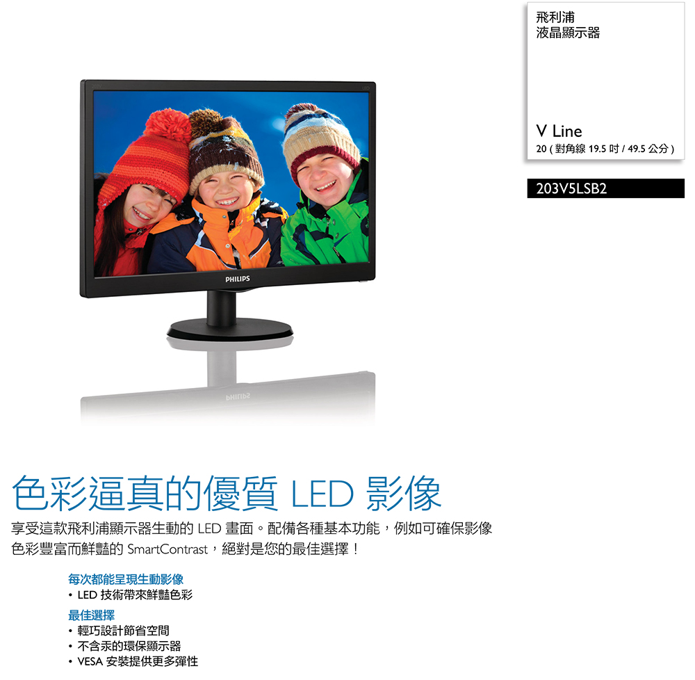 PHILIPS 203V5LSB2(1A/5ms/TN/無喇叭/1600*900 16:9)