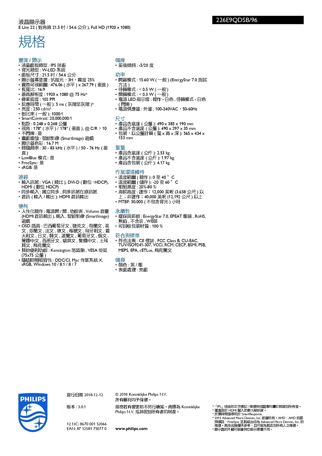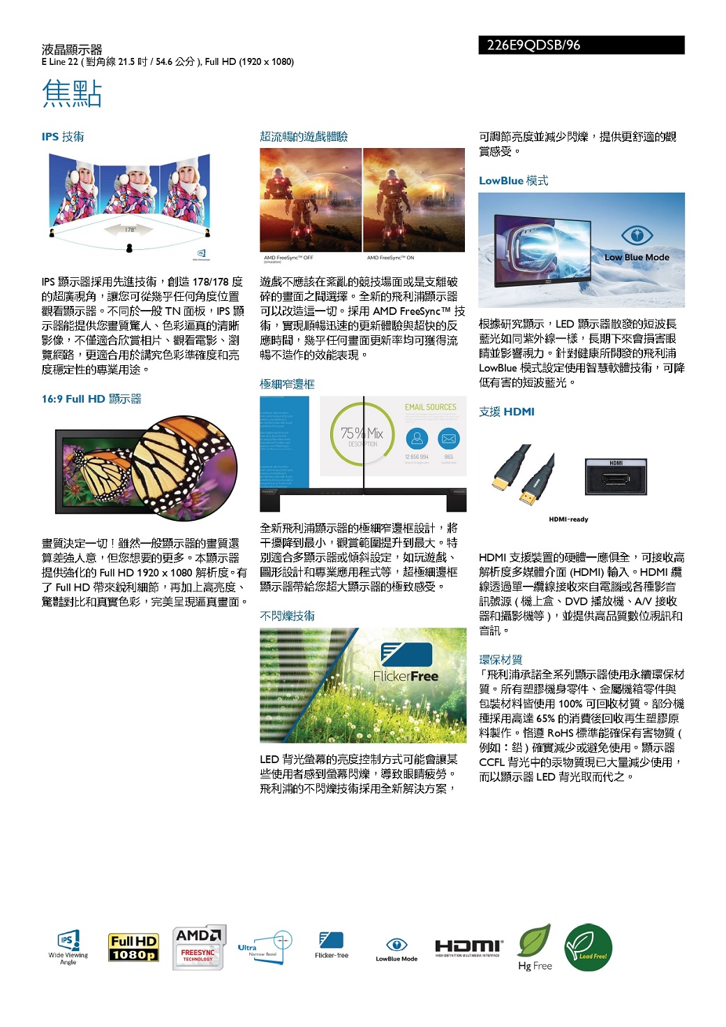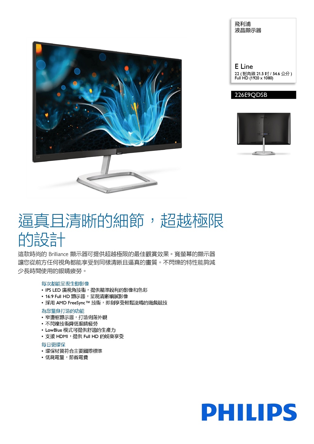 PHILIPS 226E9QDSB(1A1D1H/4ms/IPS/無喇叭/FreeSync)