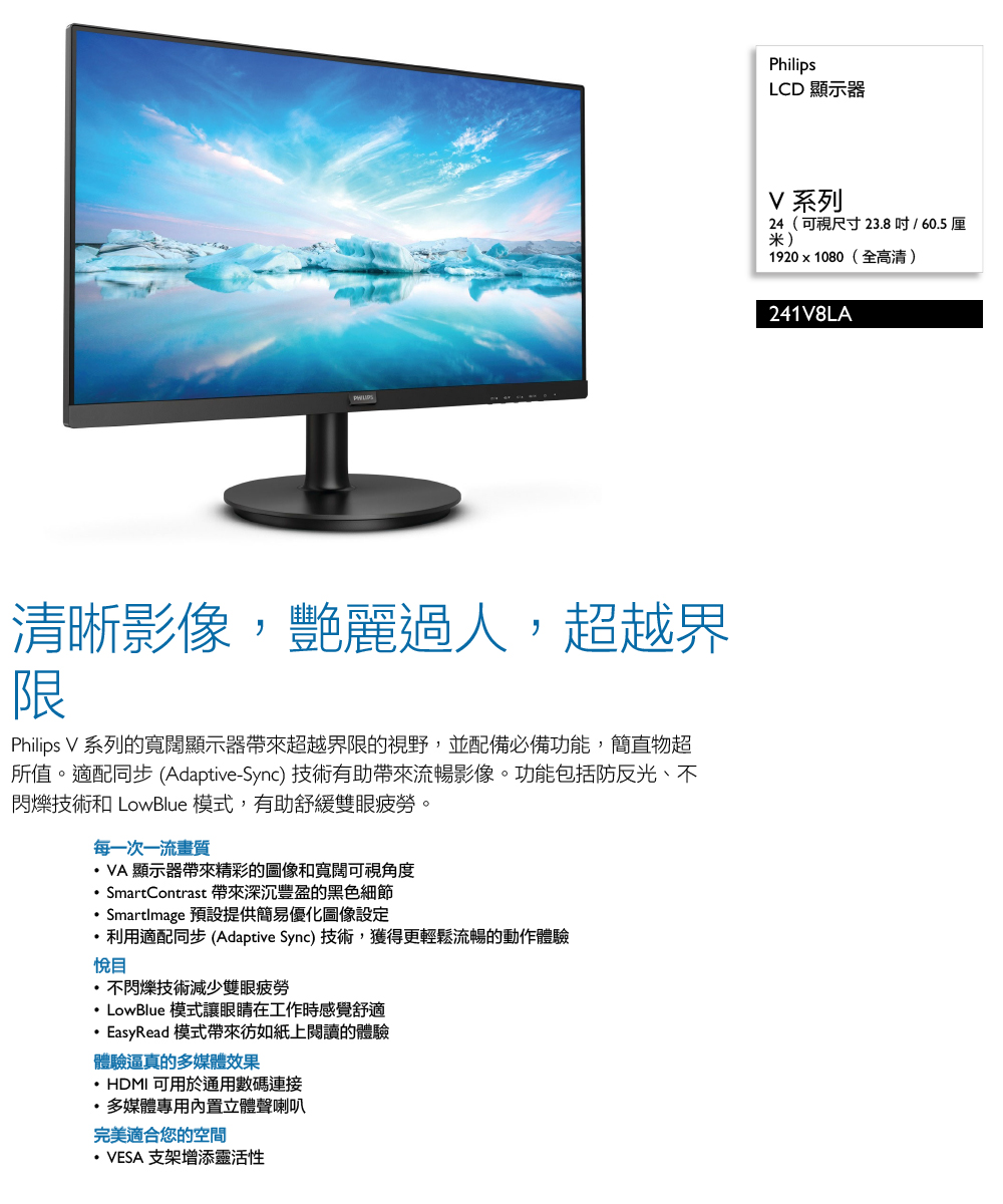 PHILIPS 241V8LA(1A1H/4ms/VA/含喇叭/ Adaptive-Sync)不閃爍.低藍光