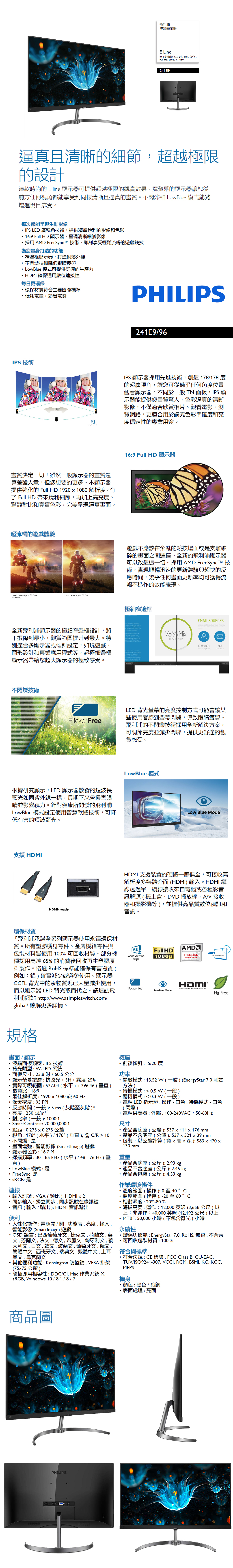 PHILIPS 241E9(1A2H/5ms/IPS/無喇叭/FreeSync)低藍光.不閃屏