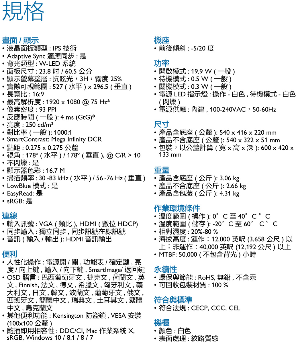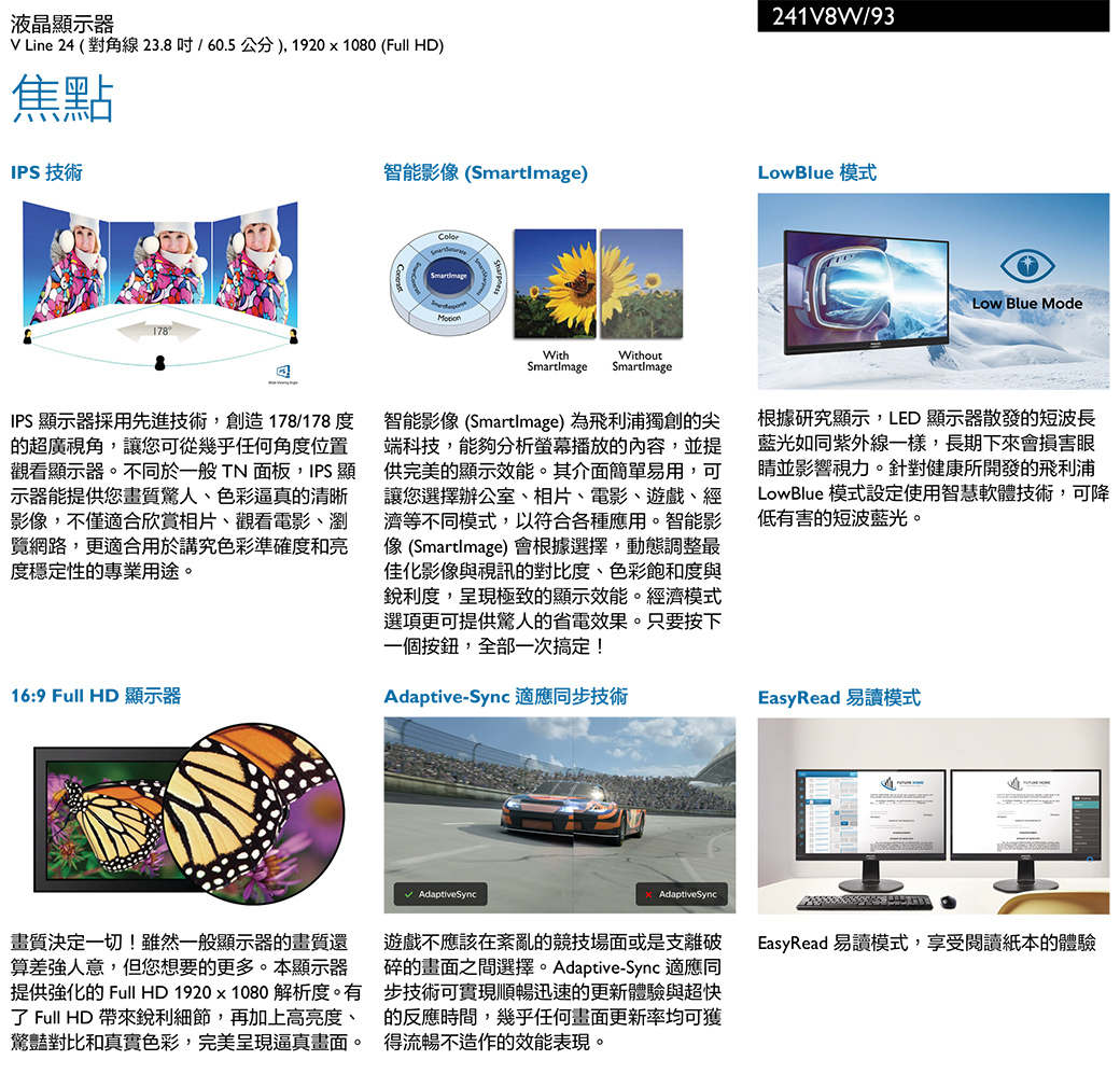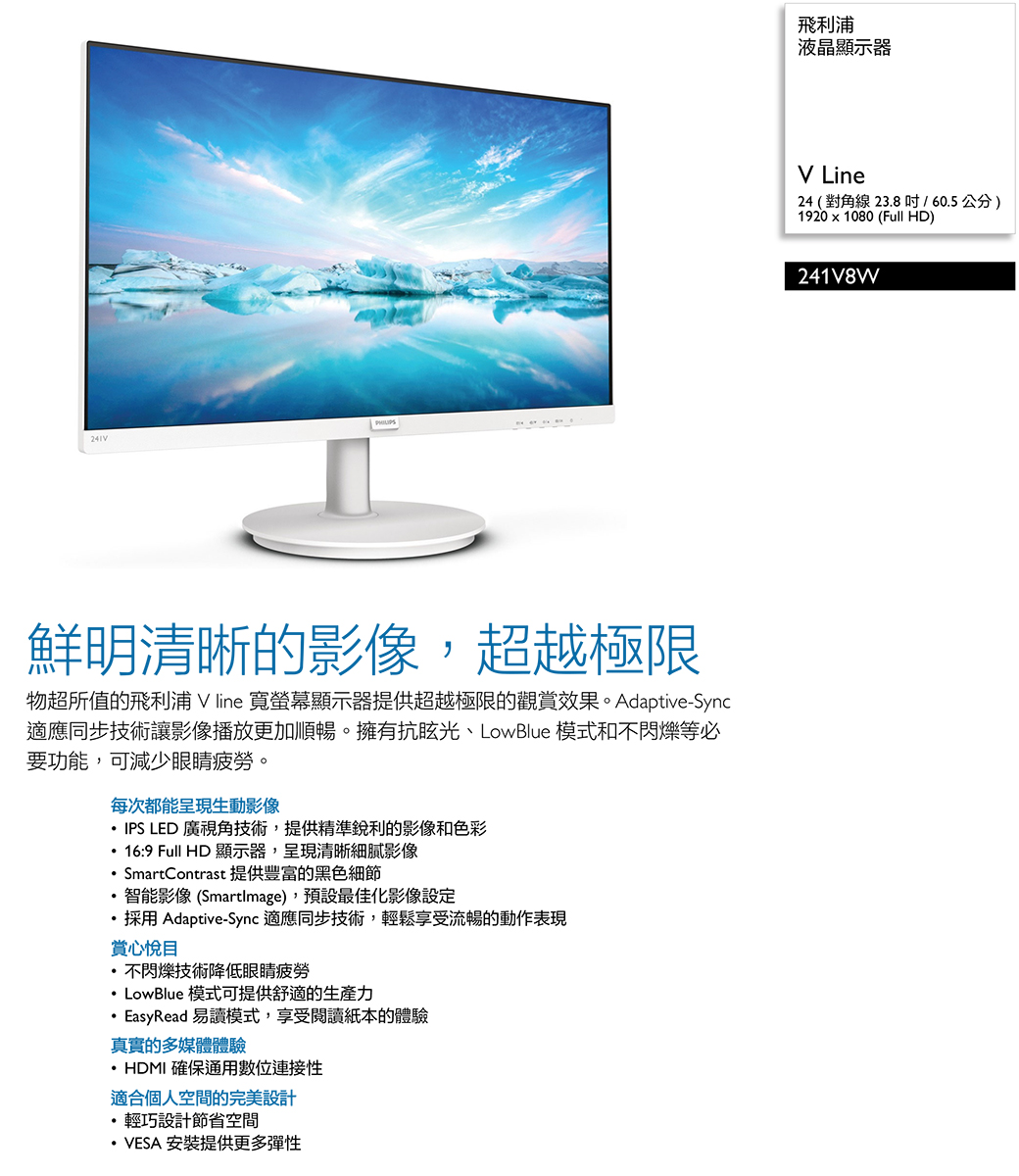 PHILIPS 241V8W(1A1H/4ms/IPS/無喇叭/Adaptive-Sync) 防反光.不