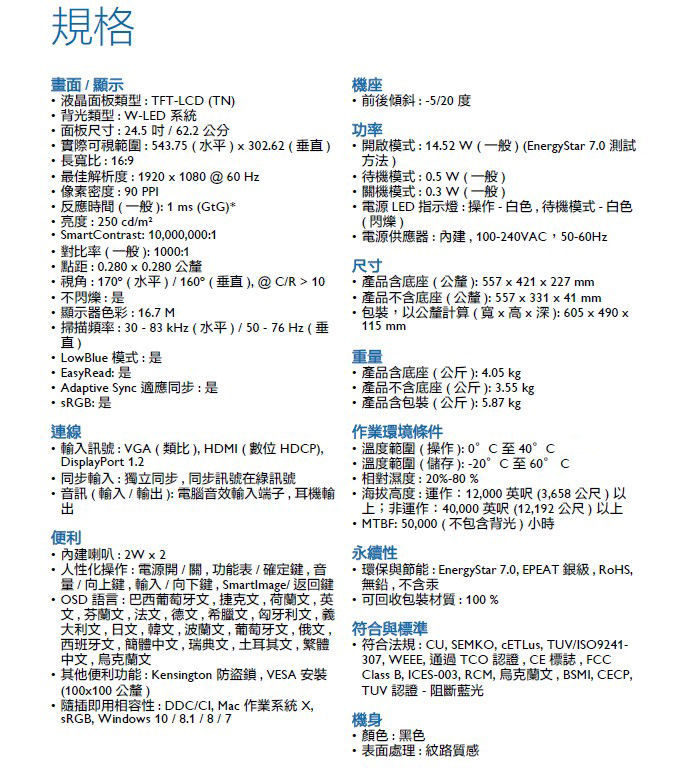 PHILIPS 253V7LJAB(1A1H1P/1ms/TN/含喇叭/Adaptive-Sync)窄邊框.藍光認証
