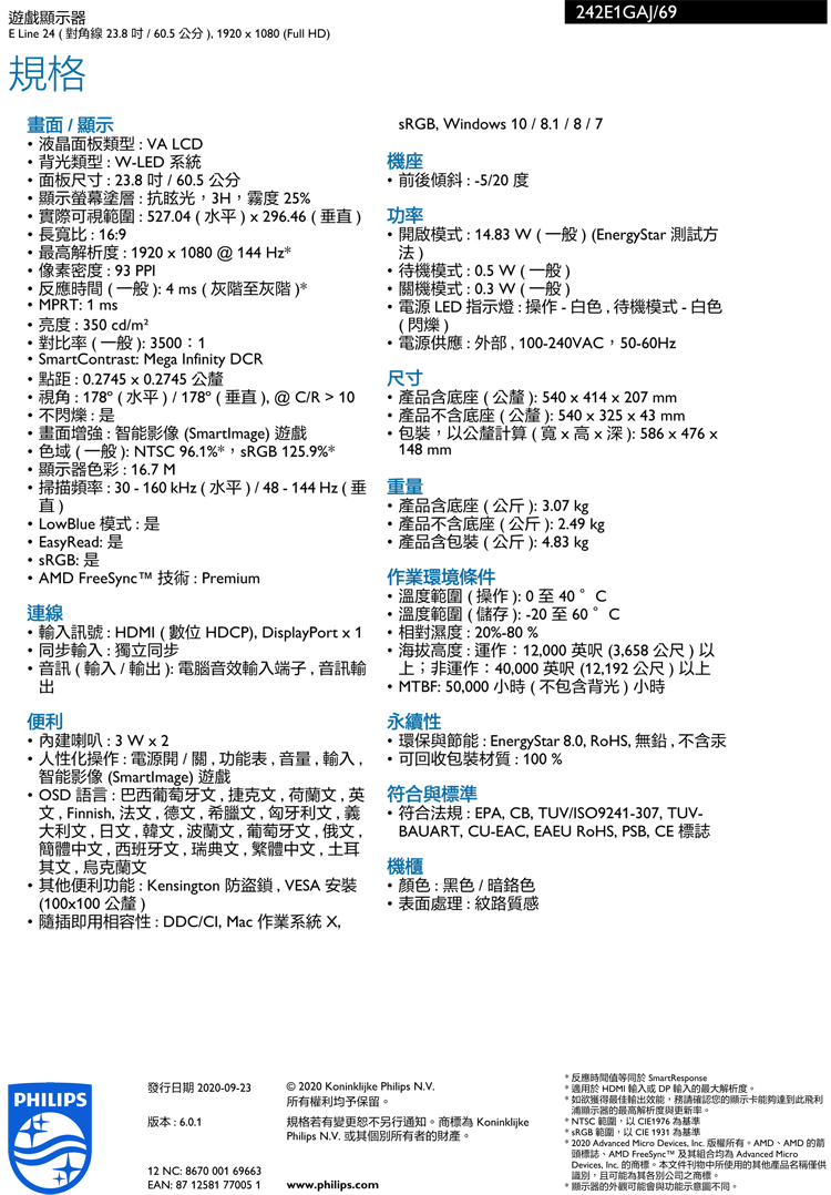 PHILIPS 242E1GAJ (1H1P/1ms/VA/144Hz/有喇叭/FreeSync) 低藍光