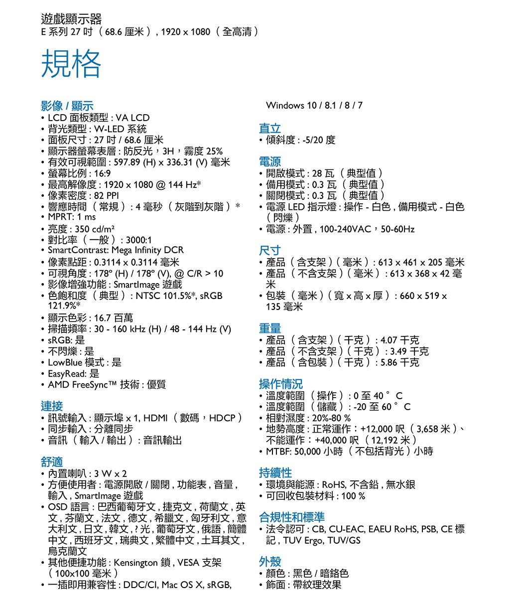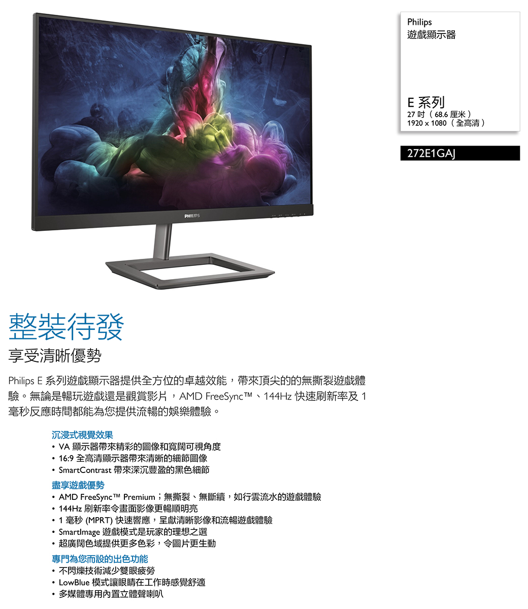 PHILIPS 272E1GAJ(1H1P/1ms/VA/144Hz/含喇叭/FreeSync Premium)