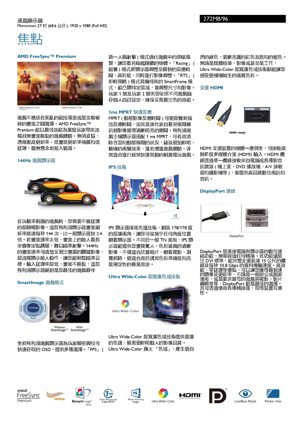 PHILIPS 272M8(1A1H1P/1ms/IPS/144Hz/無喇叭/FreeSync) 低藍光