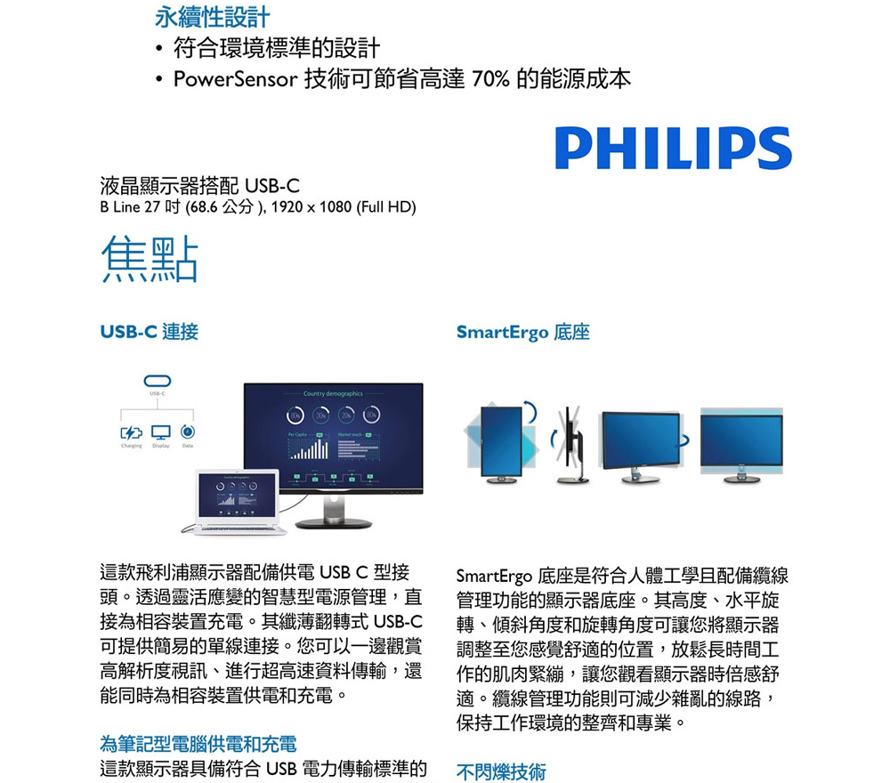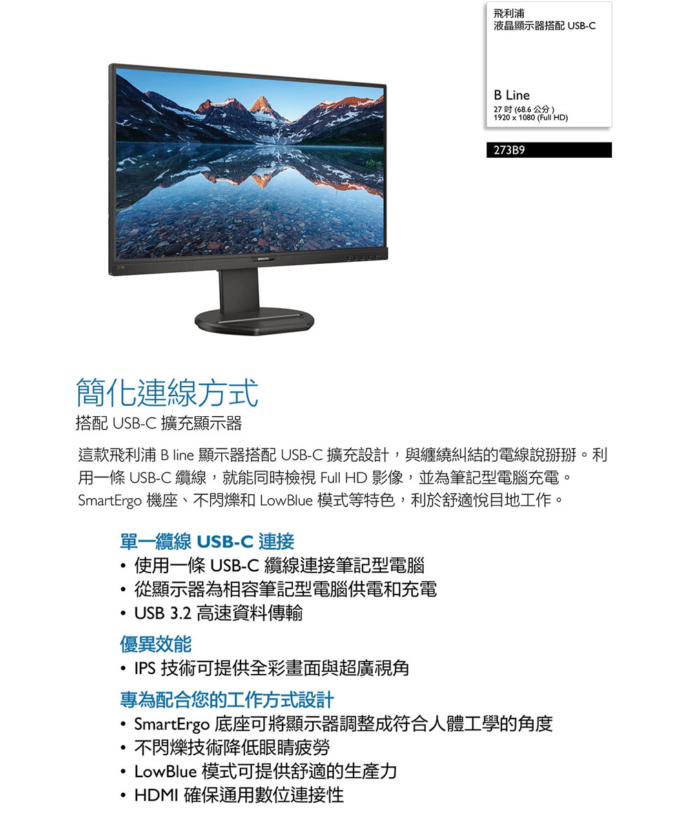 PHILIPS 273B9(1A1H1P1C/4ms/IPS/含喇叭)不閃爍.低藍光.支援65瓦
