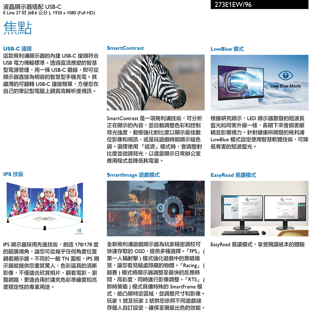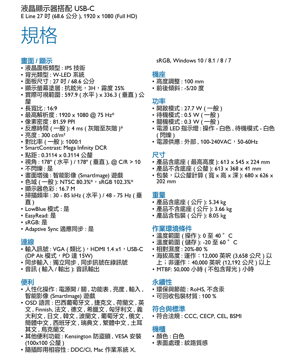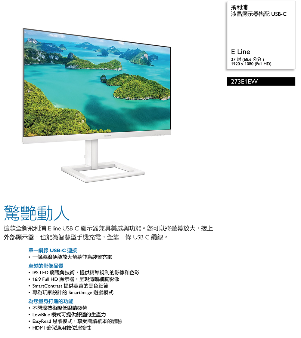 PHILIPS 273E1EW(1A1H1C/4ms/IPS/無喇叭)不閃爍.低藍光.支援15瓦