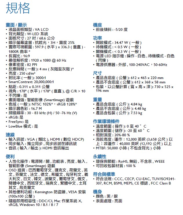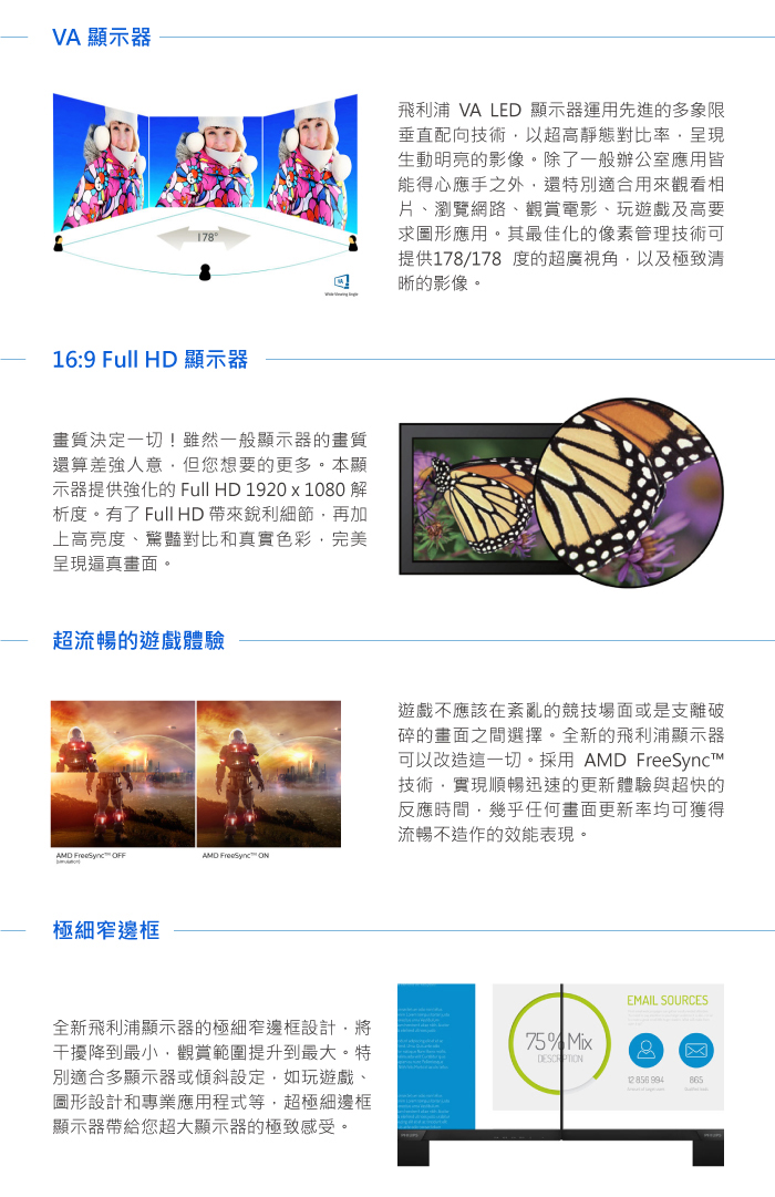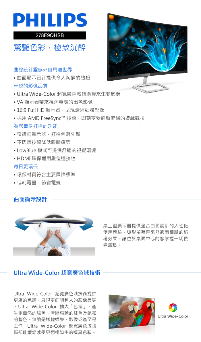 PHILIPS 278E9QHSB(1A1H/4ms/VA曲面/無喇叭/FreeSync) 低藍光.不閃頻.薄邊框