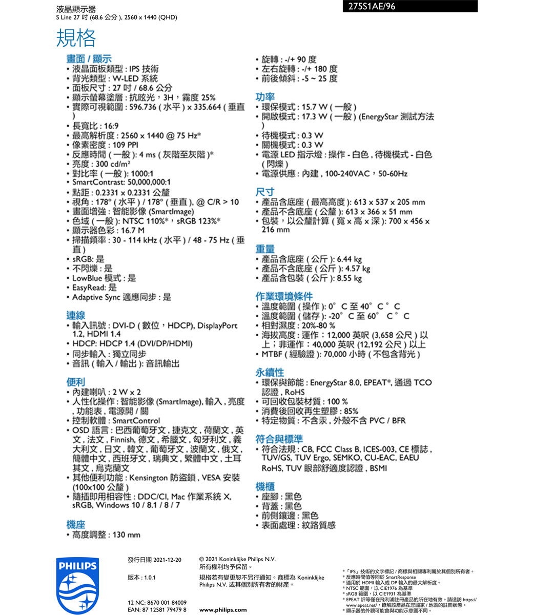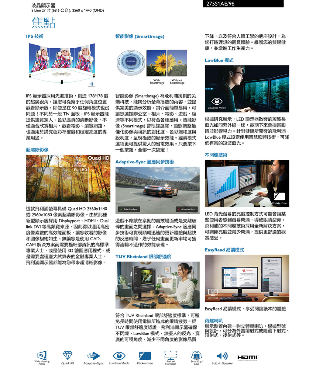 PHILIPS 275S1AE(1D1H1P/4ms/IPS/含喇叭/Adaptive-Sync) 可旋轉.傾斜.調整高低