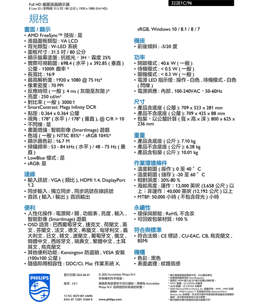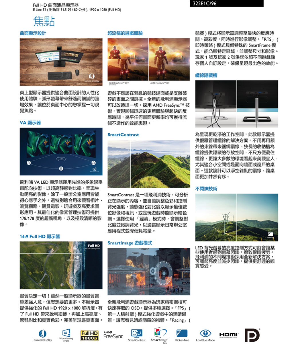 PHILIPS 322E1C (1A1H1P/4ms/VA曲面/75Hz/無喇叭/FreeSync)