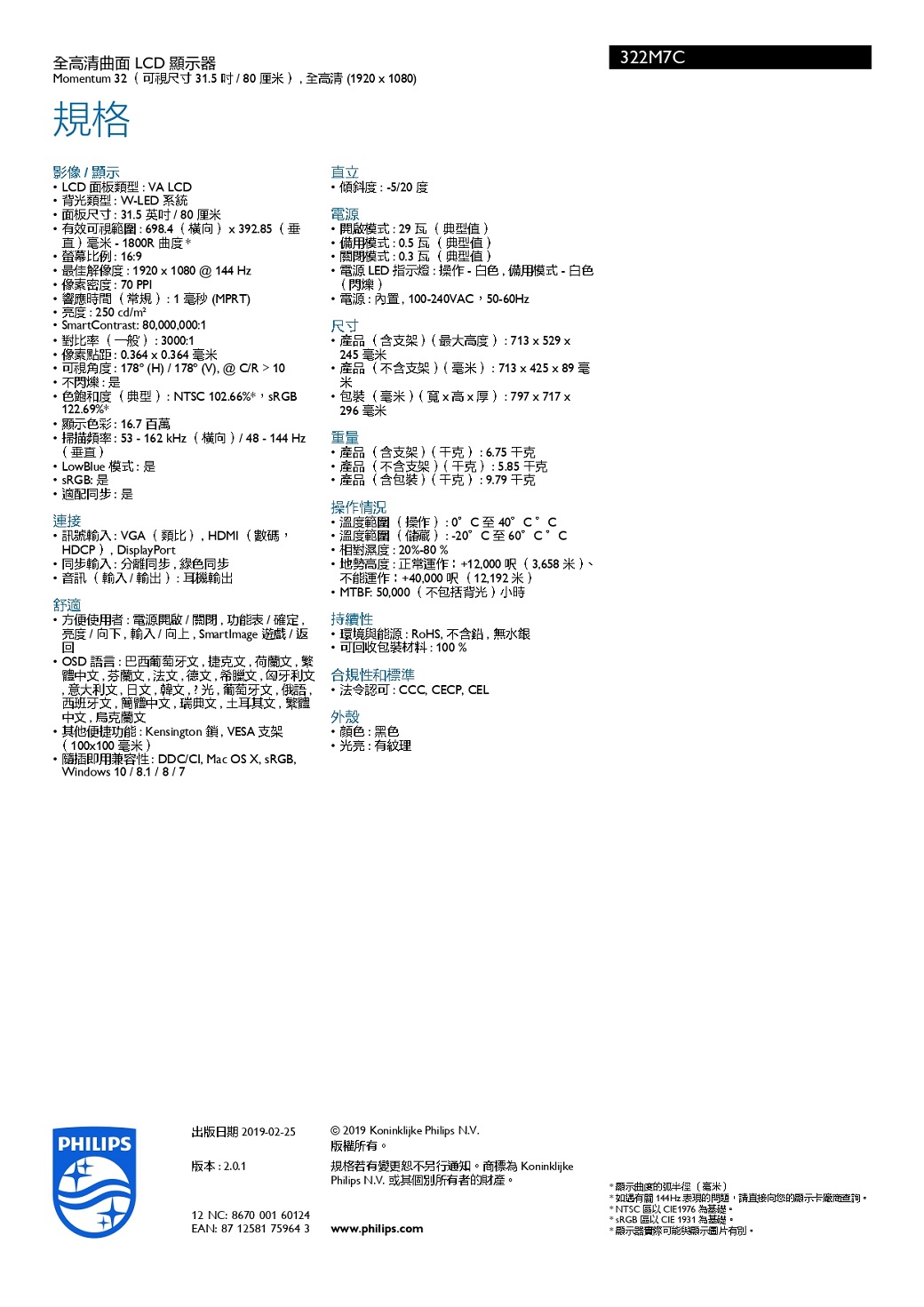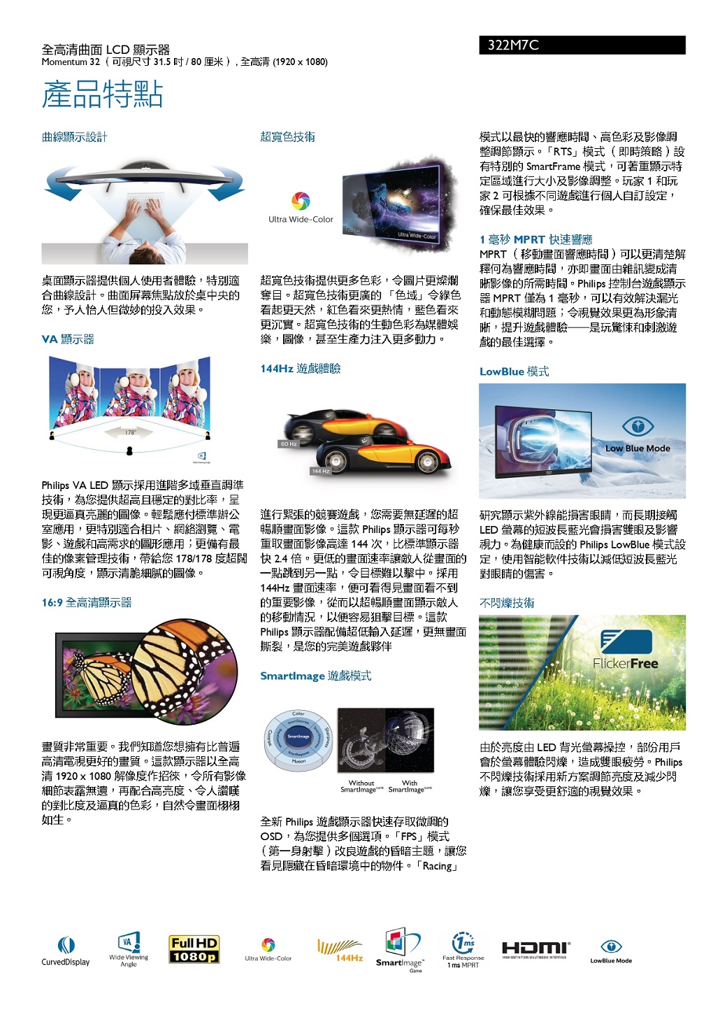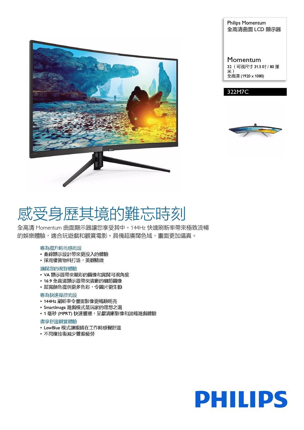 PHILIPS 322M7C(1A1H1P/1ms/VA曲/144Hz/無喇叭/FreeSync)超廣闊色域電競機