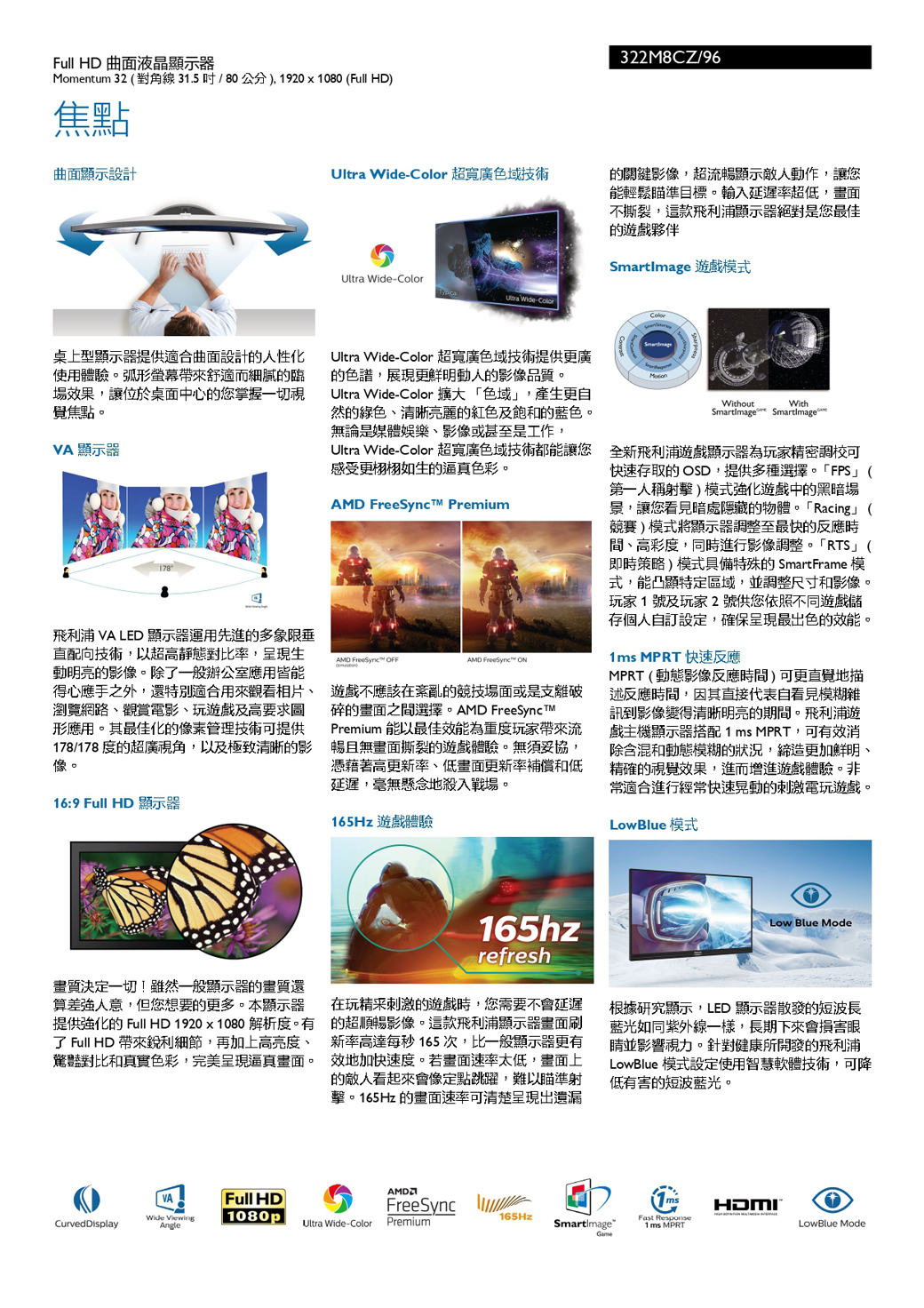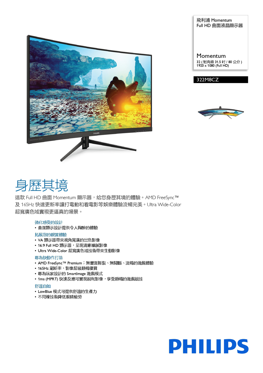PHILIPS 322M8CZ(1A2H1P/1ms/VA曲面/165Hz/無喇叭/FreeSync)*廣