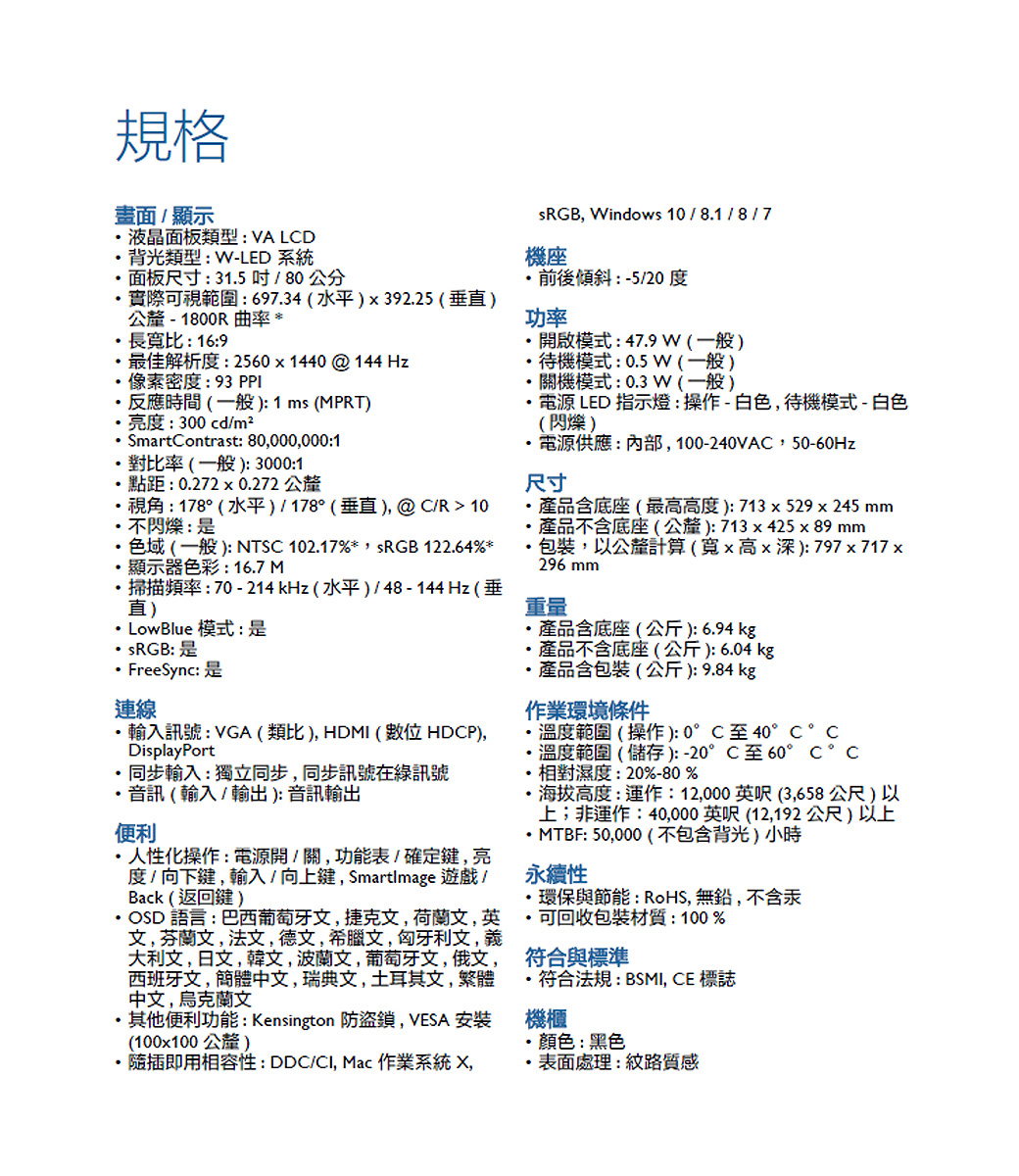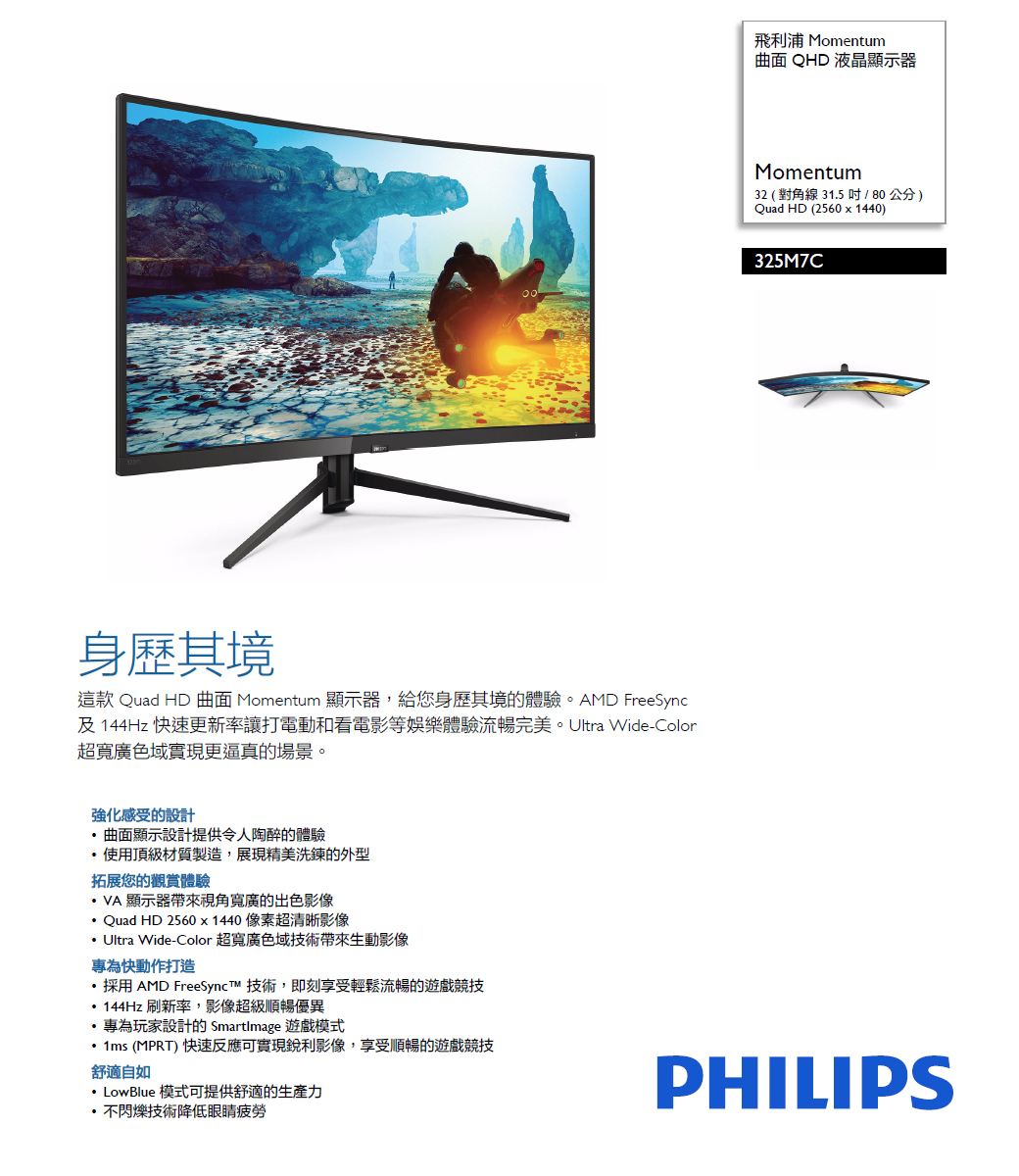 PHILIPS 325M7C(1A1H1P/1ms/VA曲/144Hz/無喇叭/FreeSync)超廣闊色域電競機