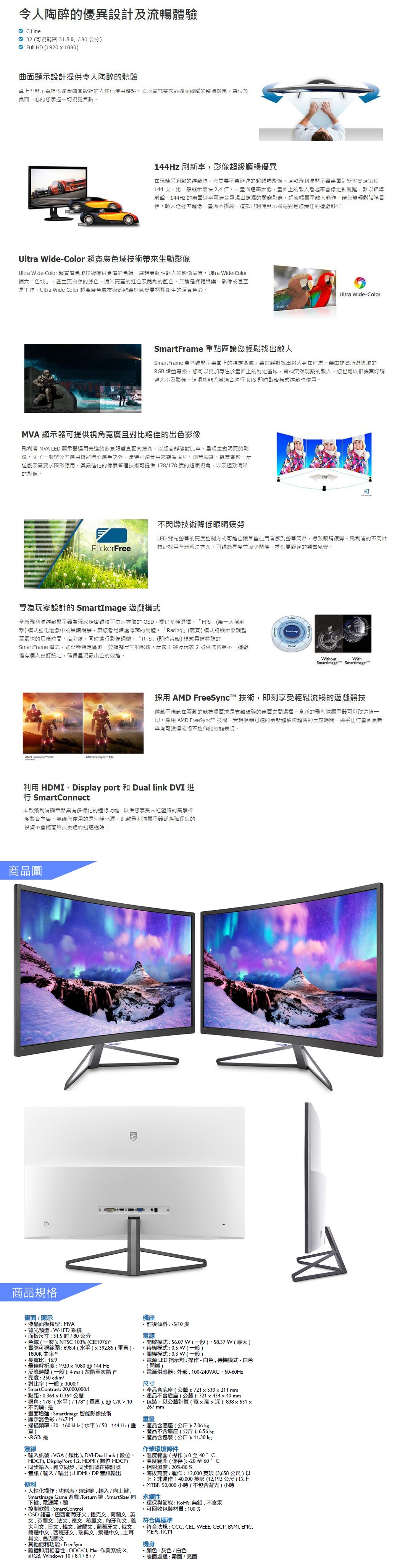 PHILIPS 328C7QJSG(1A1D1H1P/2千萬/4ms/MVA曲面/144Hz/無喇叭/FreeSync)
